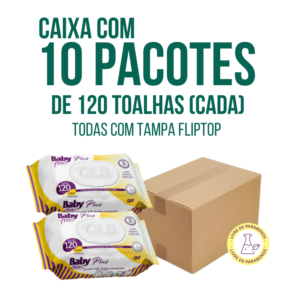 Caixa com 10 Lenços/Toalhas Umedecidas Baby Free Plus c/ 120 Unidades Cada – Tampa FlipTop