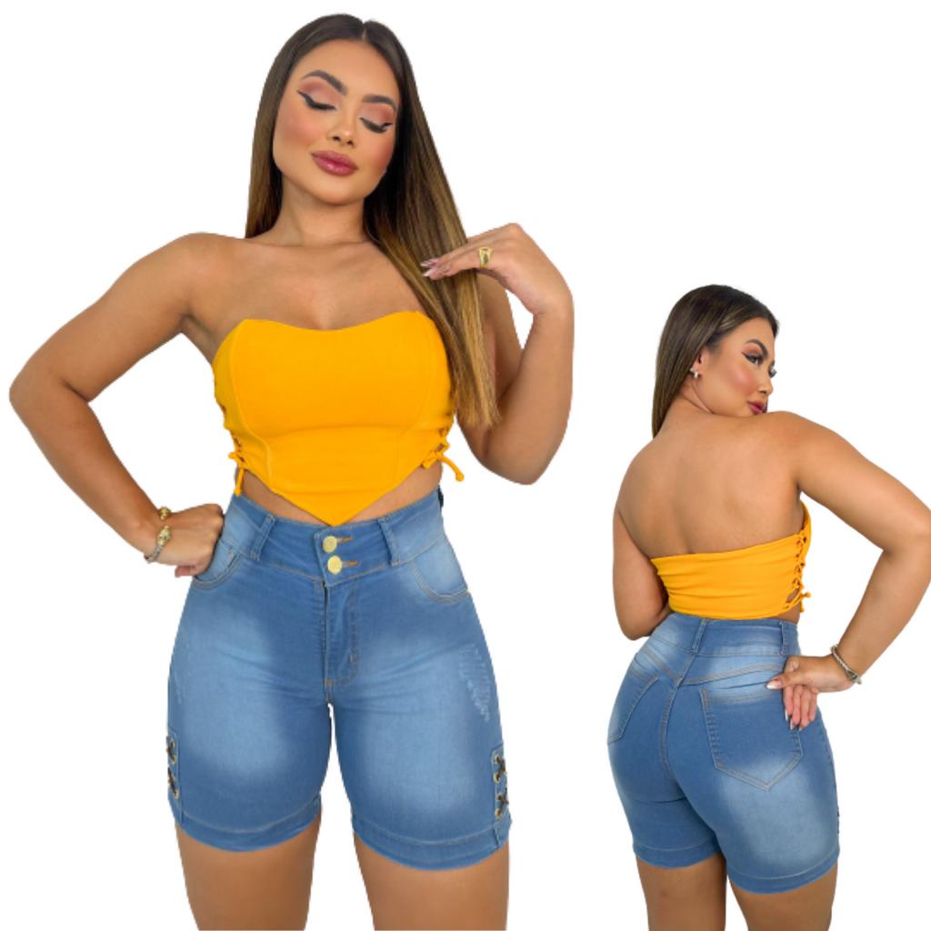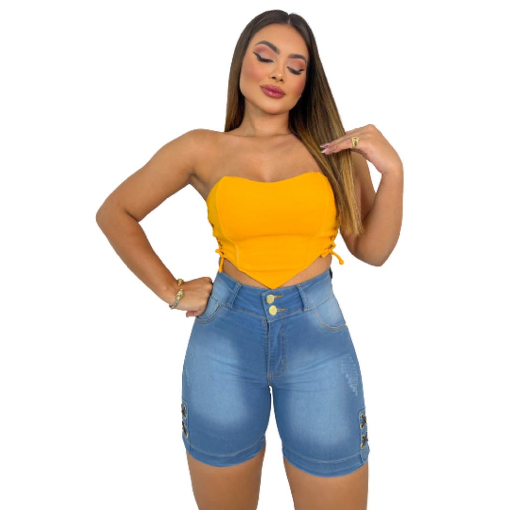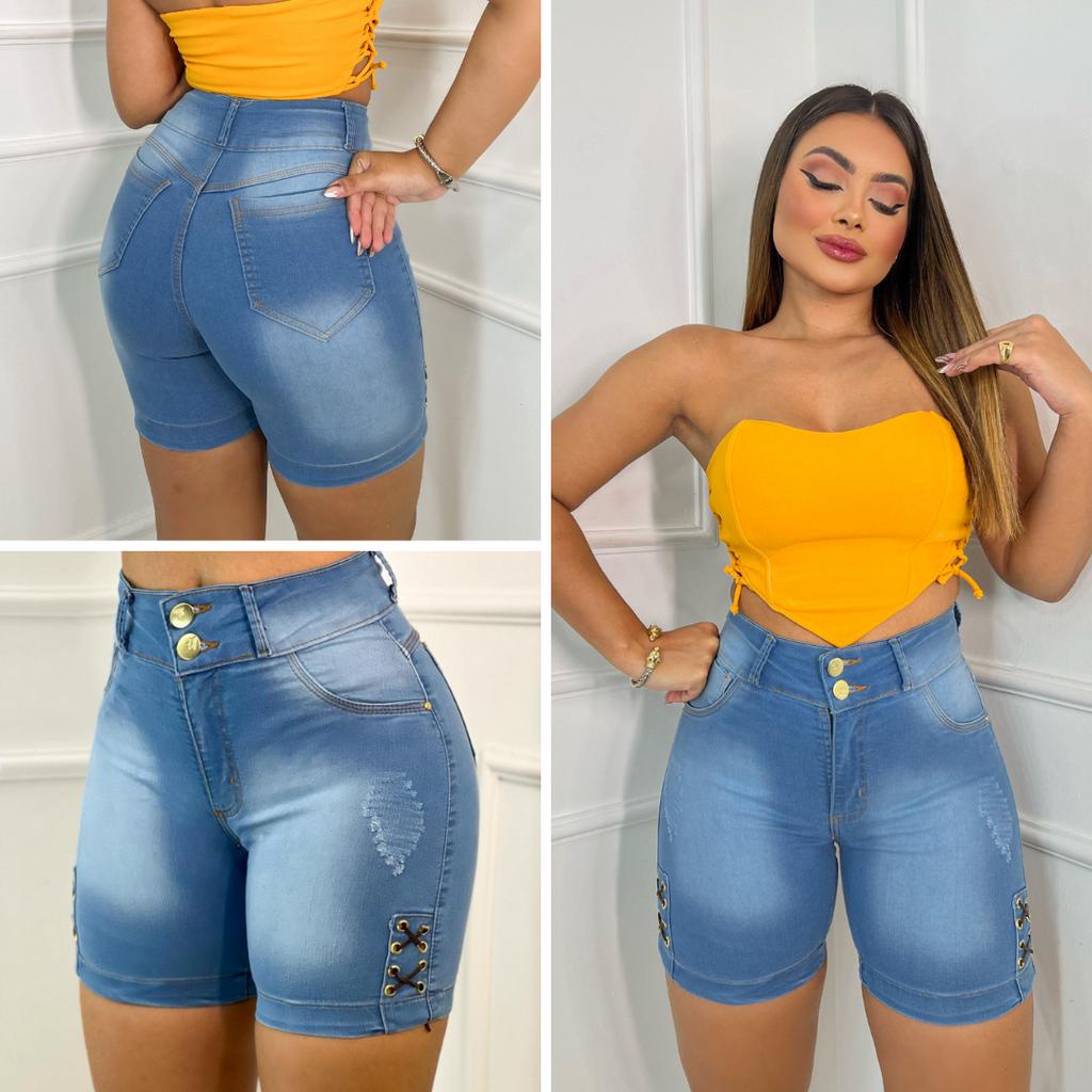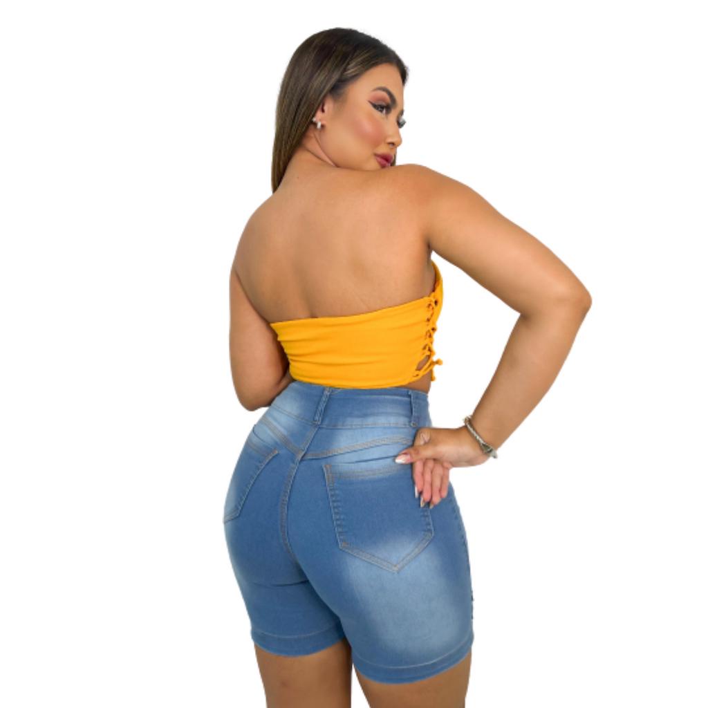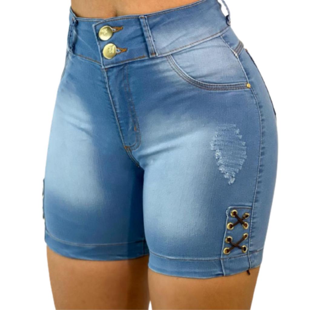 Short Jeans Feminino Cintura Alta-Bermuda Meia Coxa Com Lycra