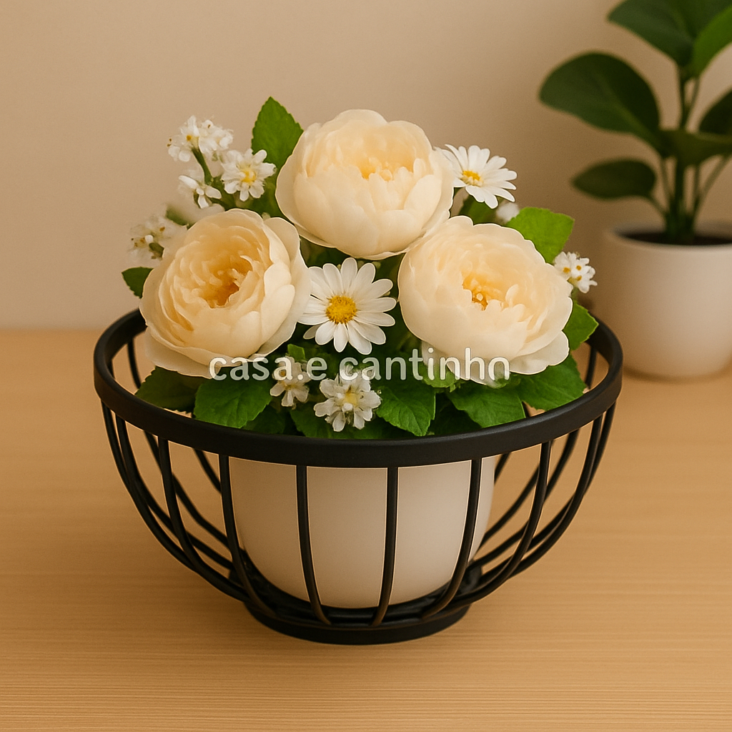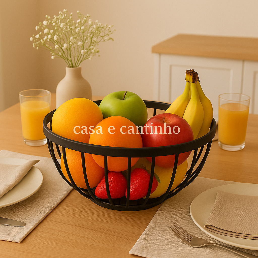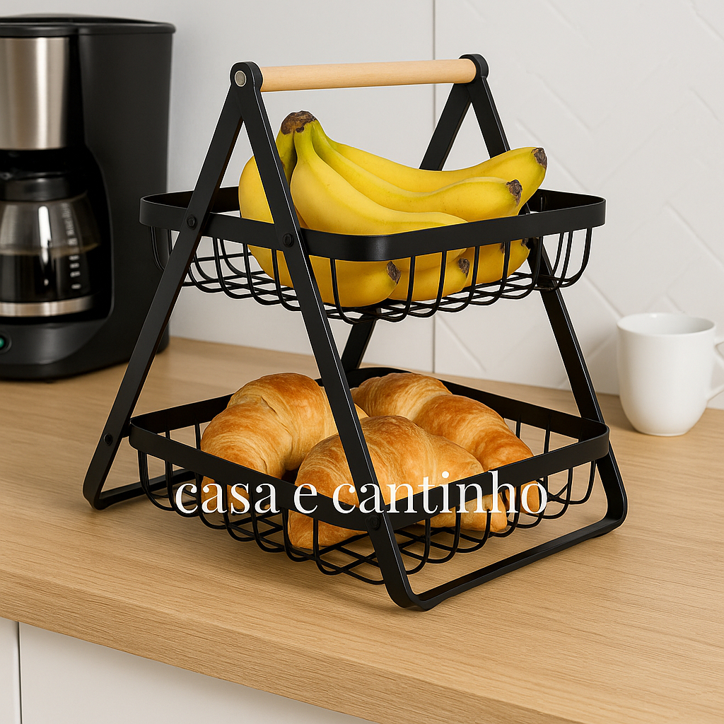 Fruteira de Mesa Rustica de Ferro e Bambu para Café da Manhã Multiuso de Metal Preto