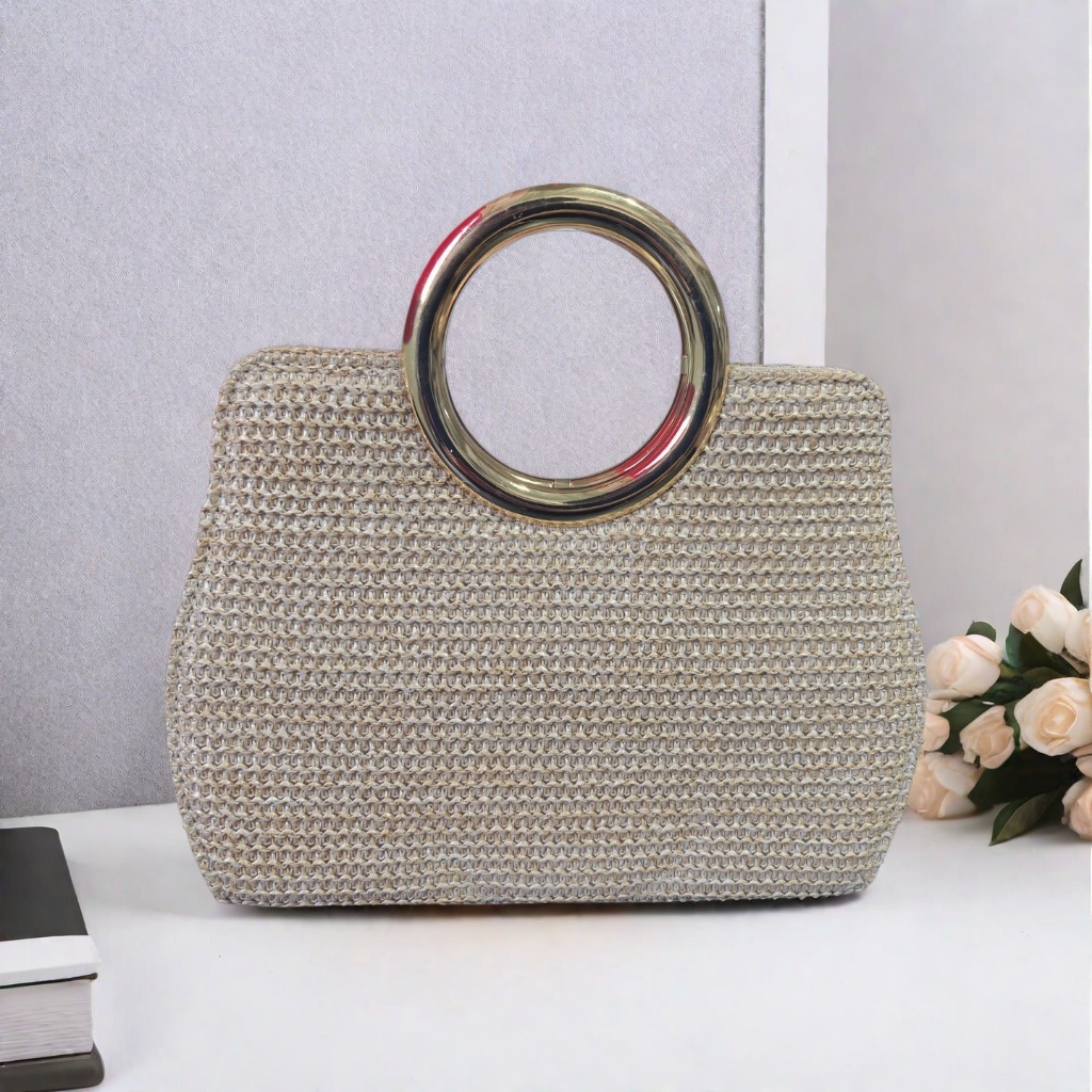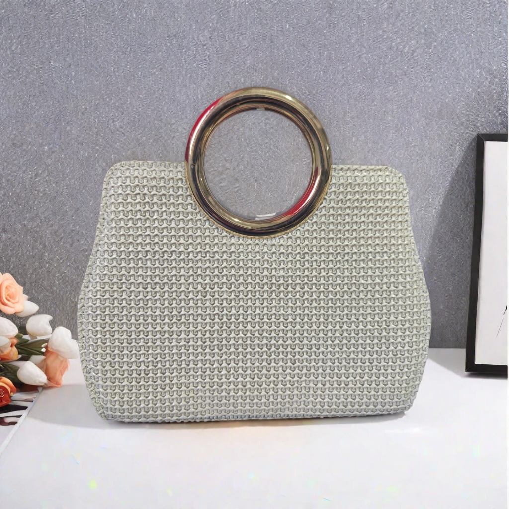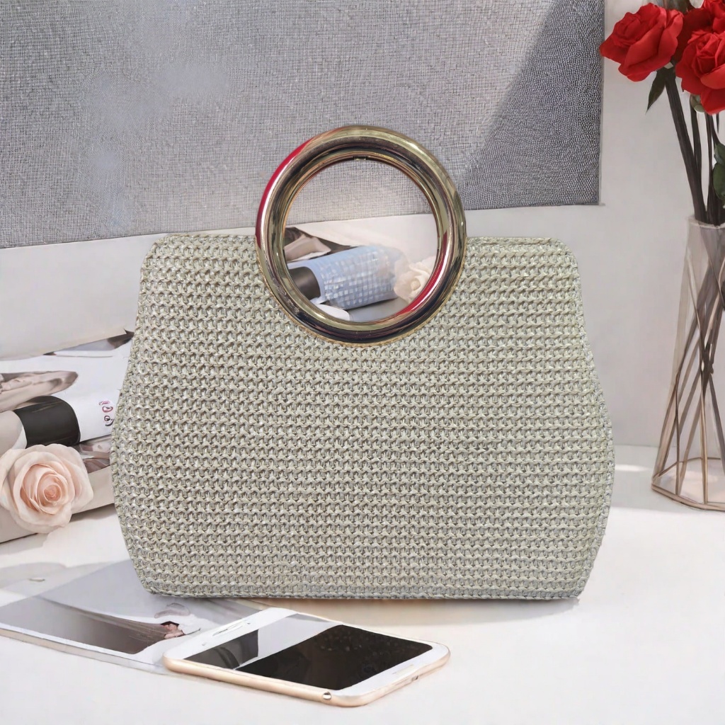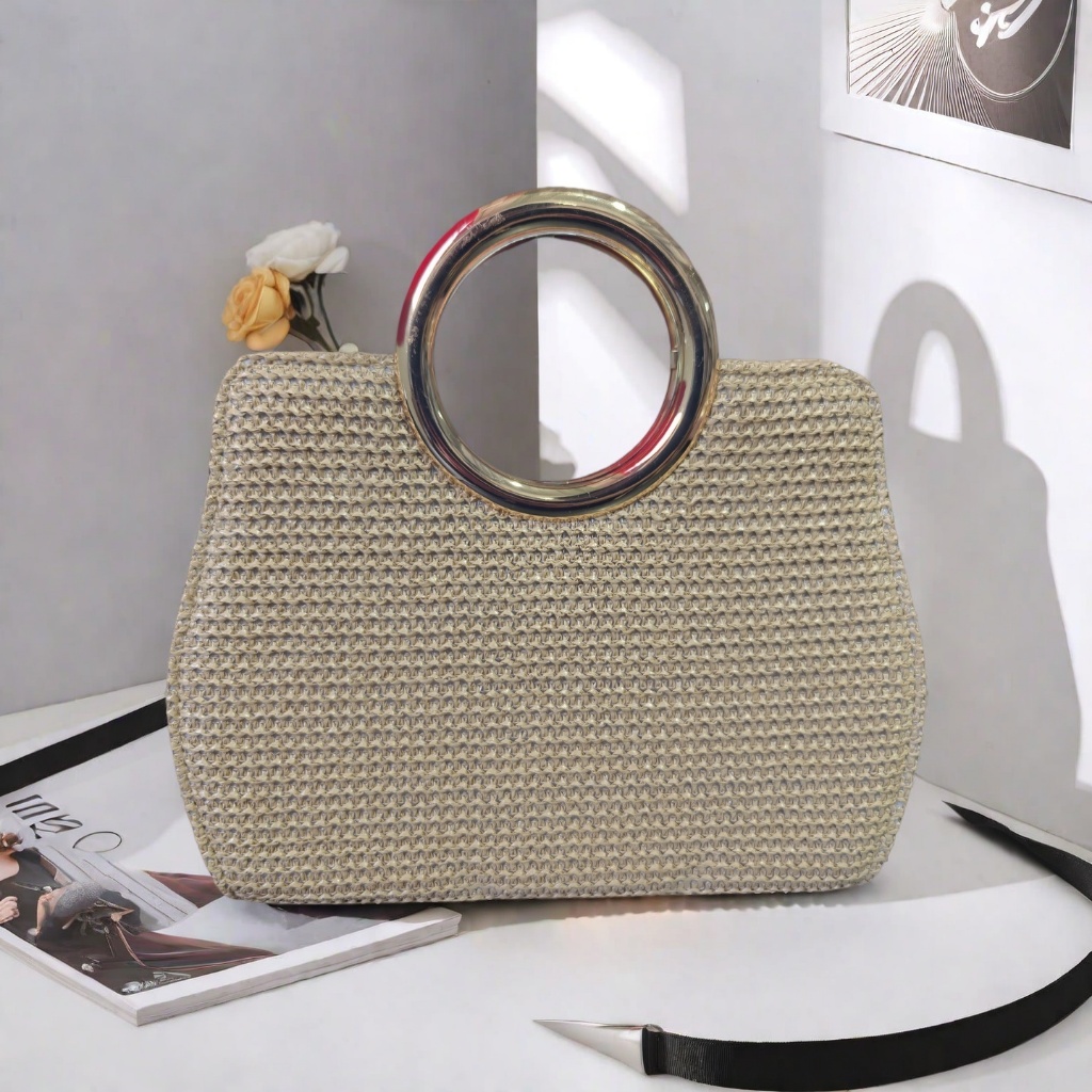 Bolsa Tote De Praia Feminina De Palha Tecida Crossbody Com Fecho De Corrente