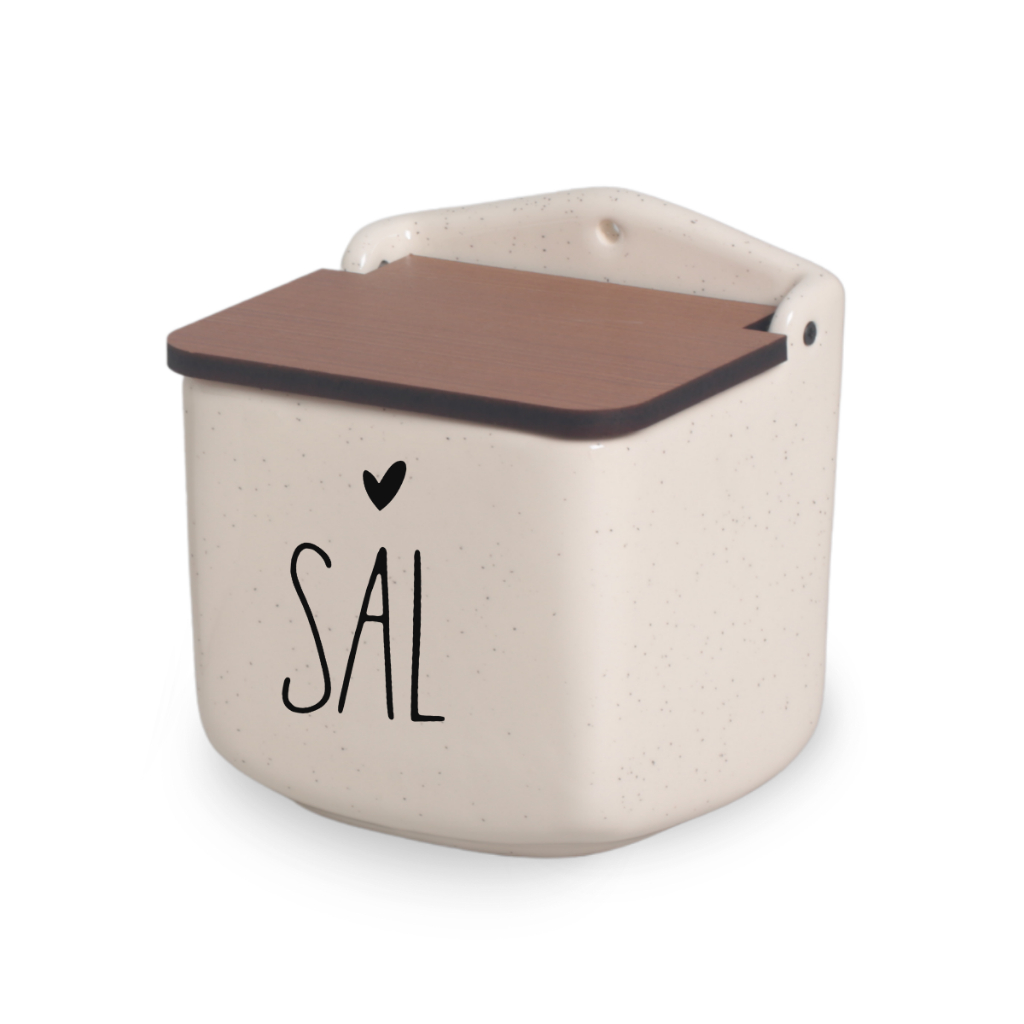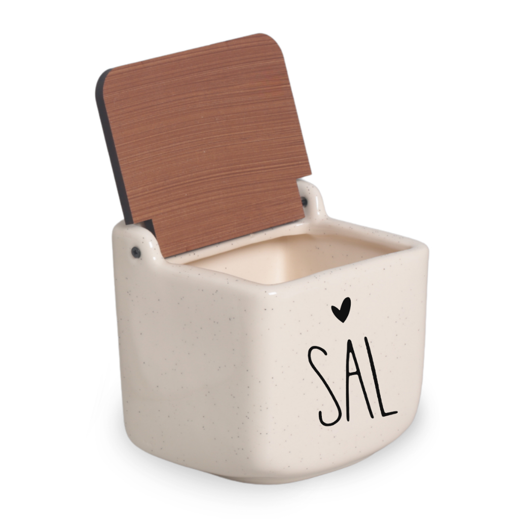 Saleiro Duo Bege de Cerâmica Tampa de MDF Segunda Linha Defeitos Cozinha Decoração SAL CORAÇÃO DUO
