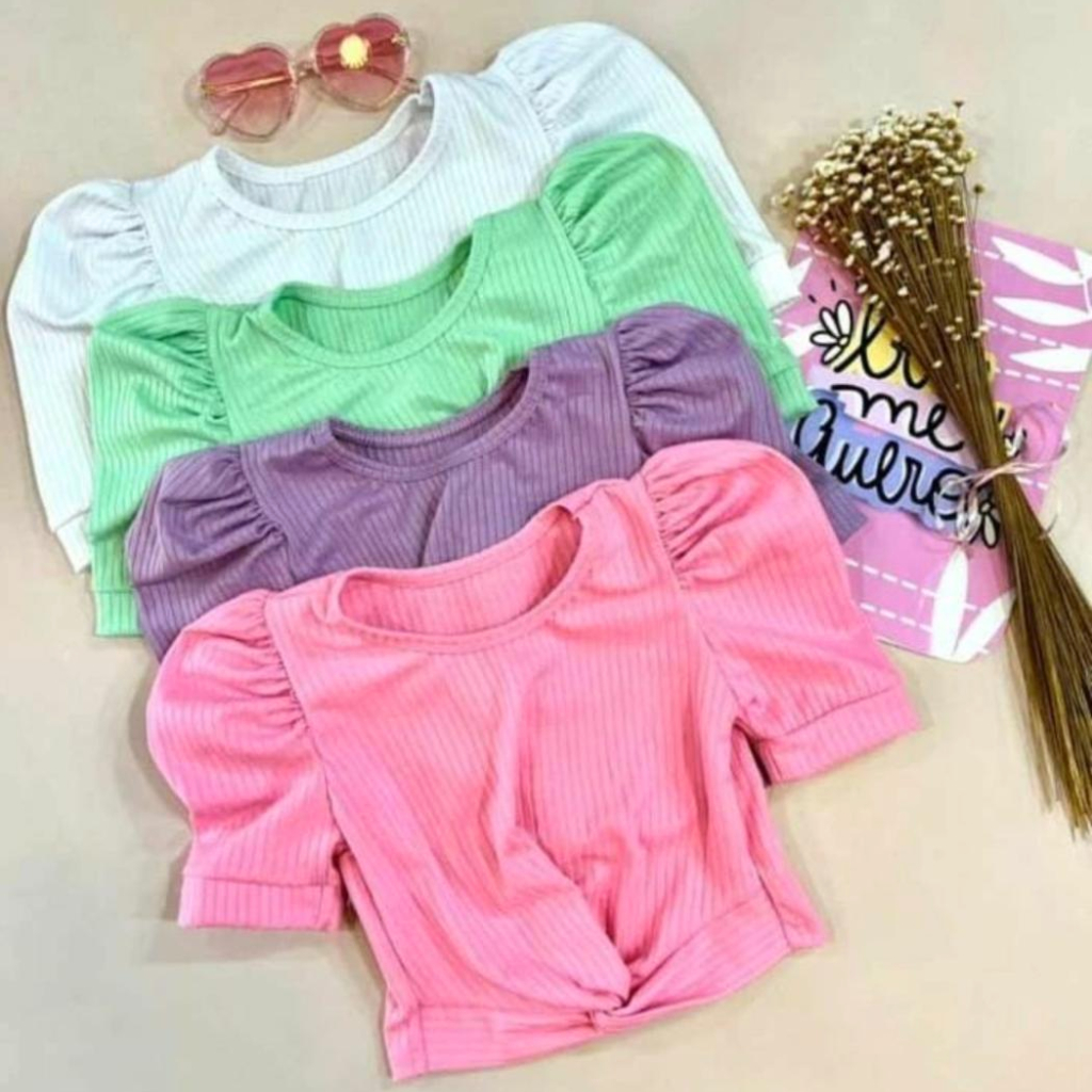 Blusa Canelada Menina Manga Curta Nozinho na Cintura
