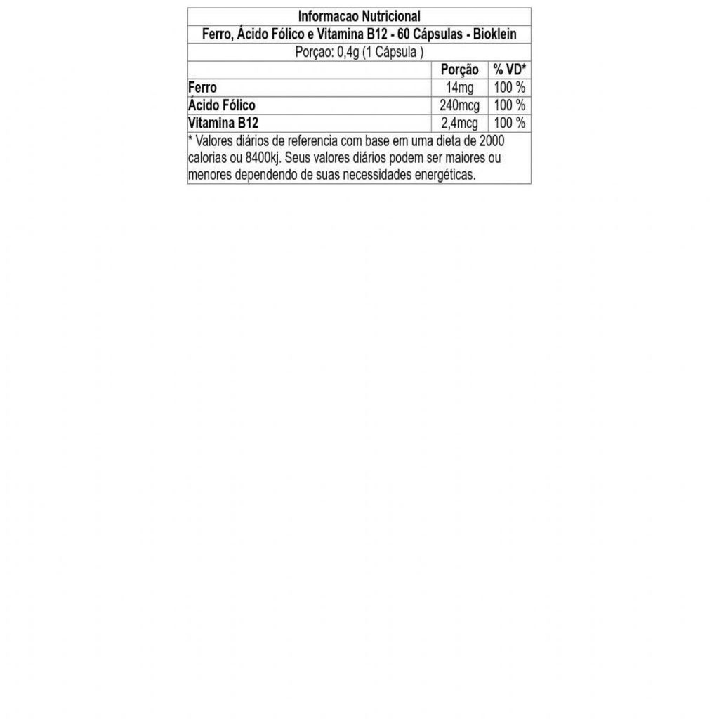 Ferro, Ácido Fólico e Vitamina B12 - 60 Cápsulas - Bioklein