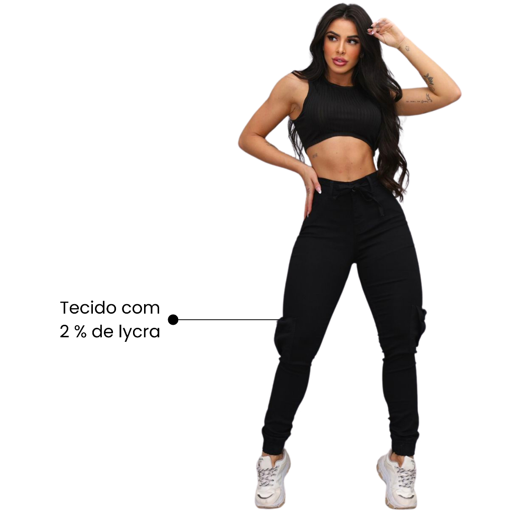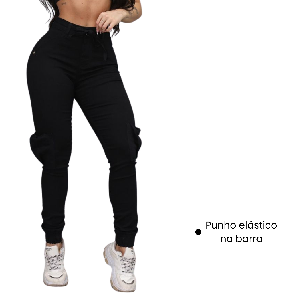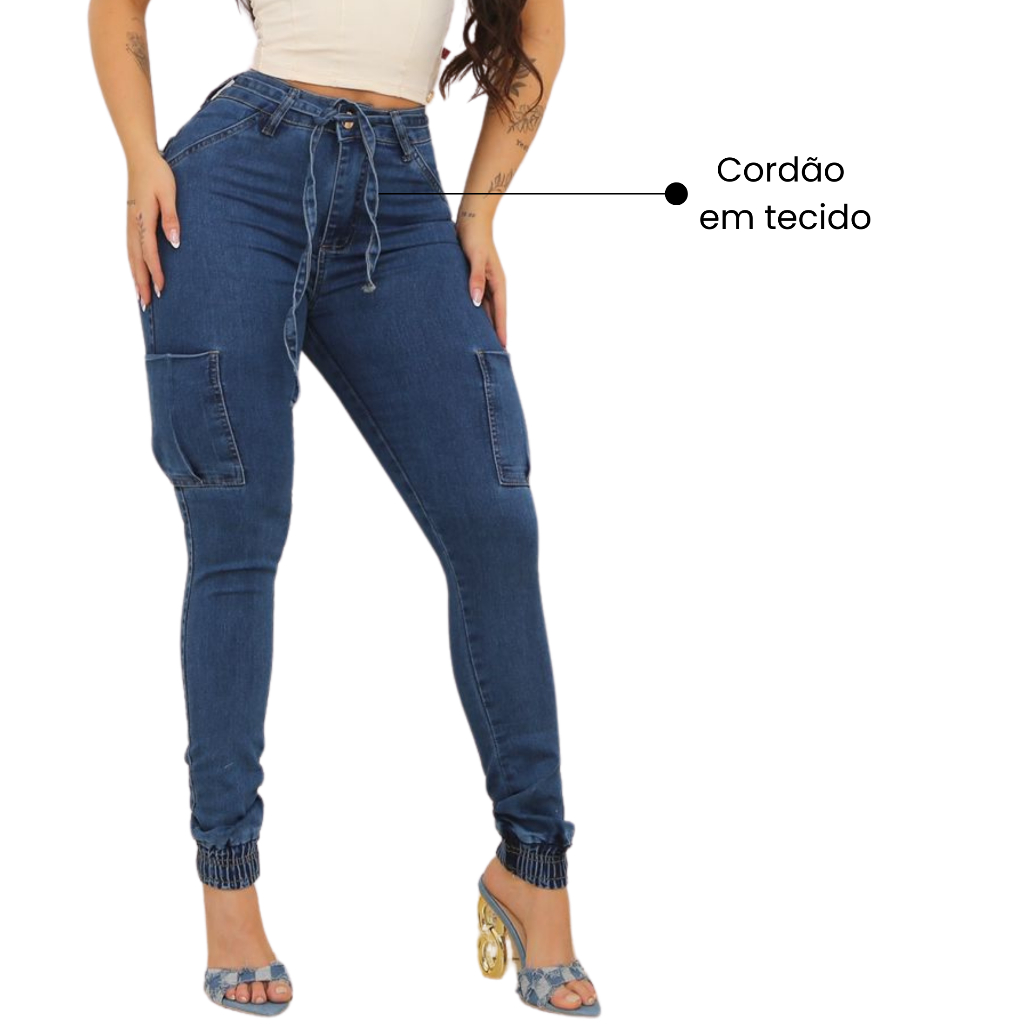 Calça Cargo Feminina Jogger Jeans com Lycra Lateral Cordão e Punho Moda Premium