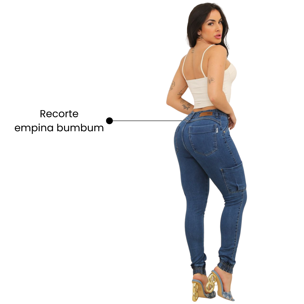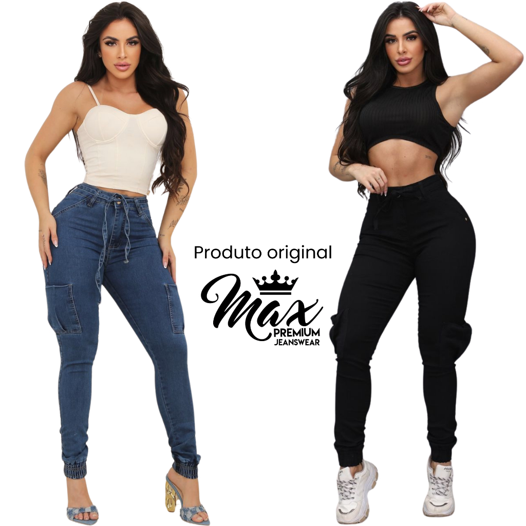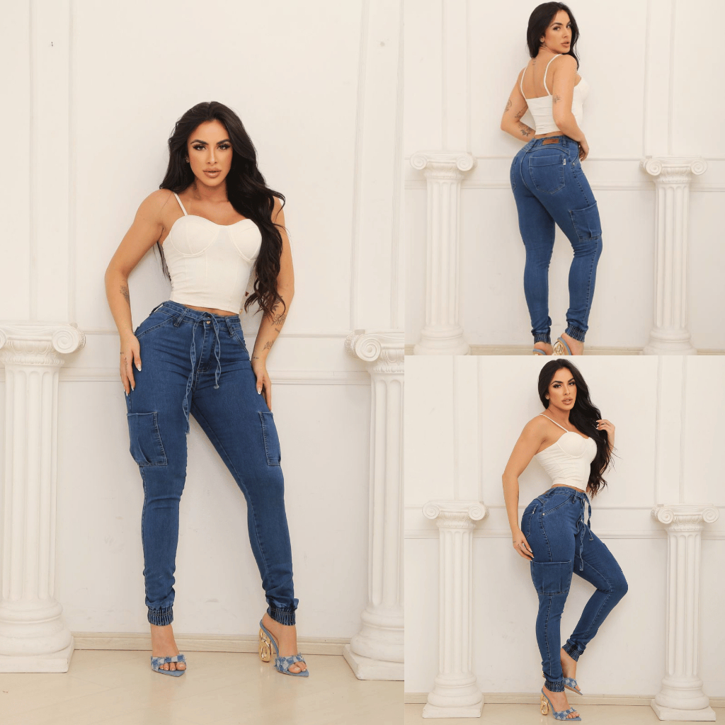 Calça Cargo Feminina Jogger Jeans com Lycra Lateral Cordão e Punho Moda Premium