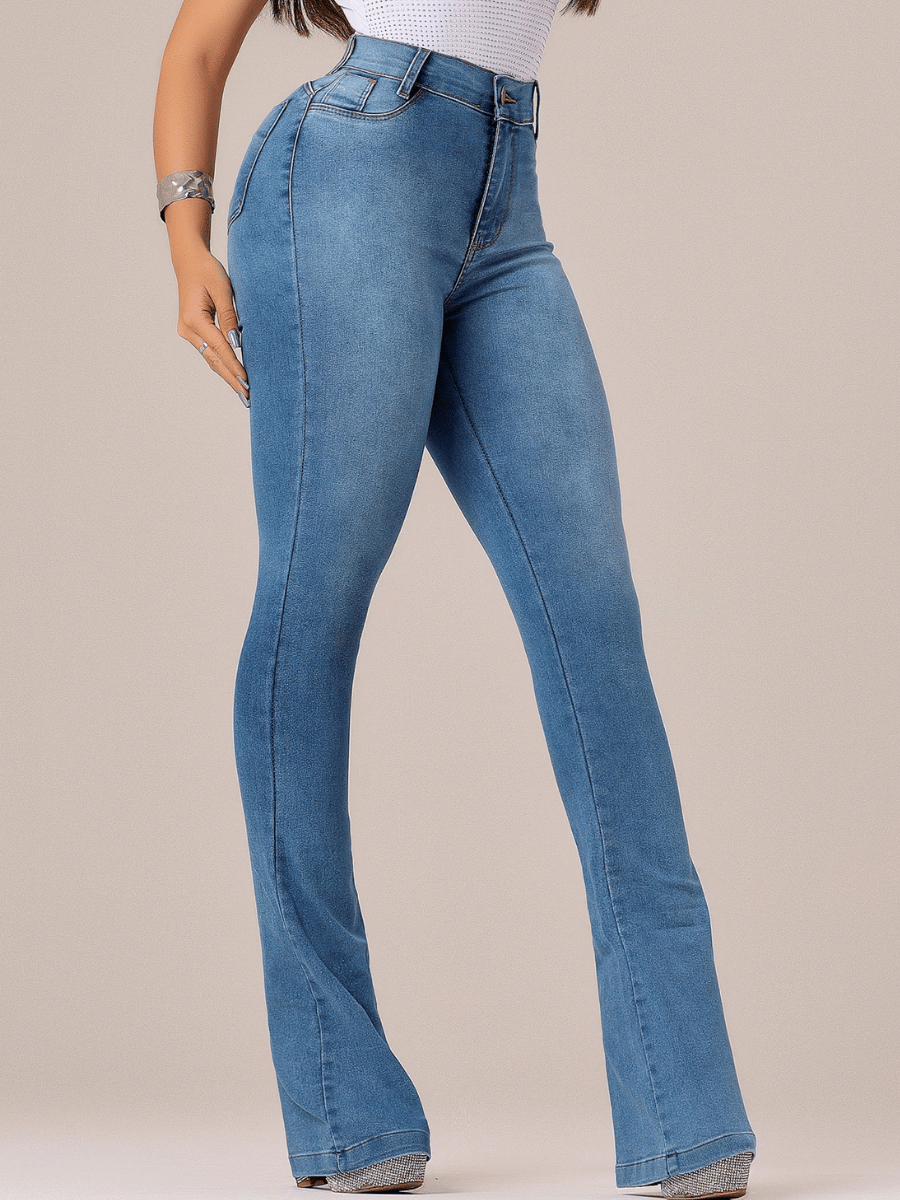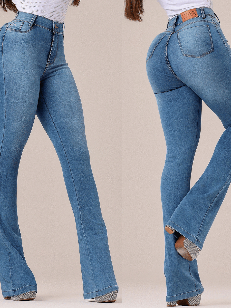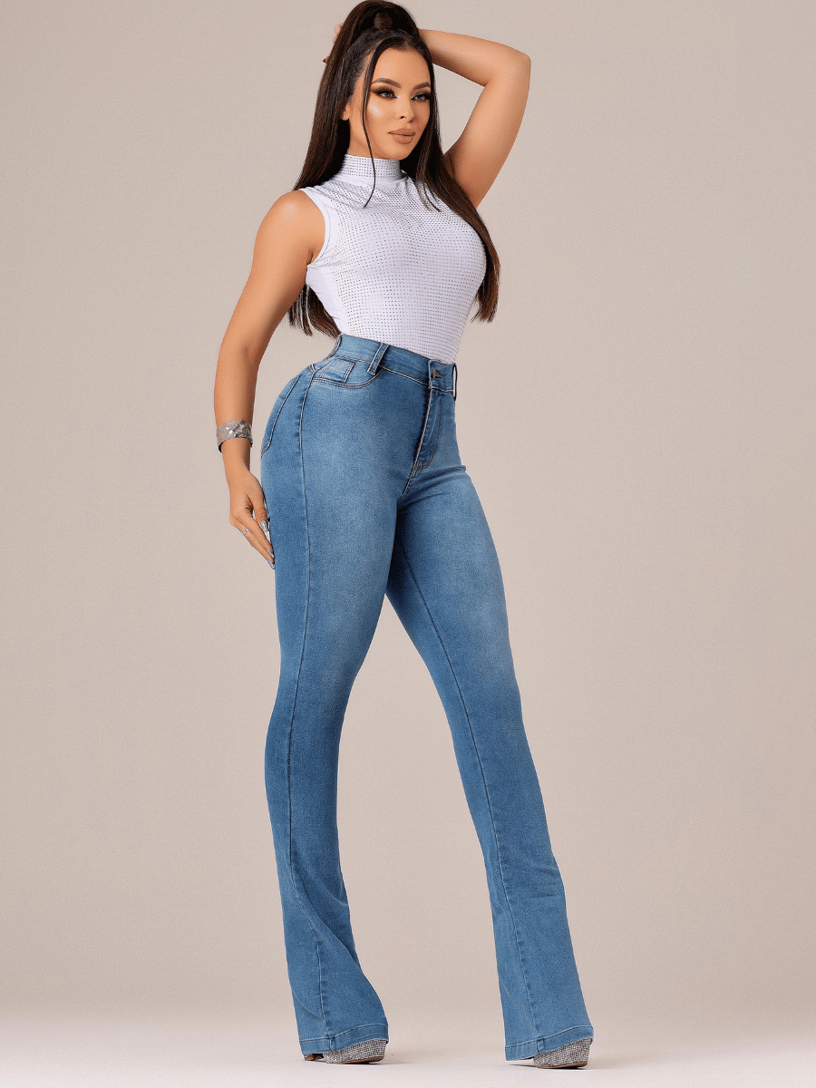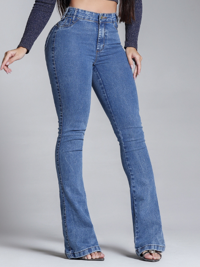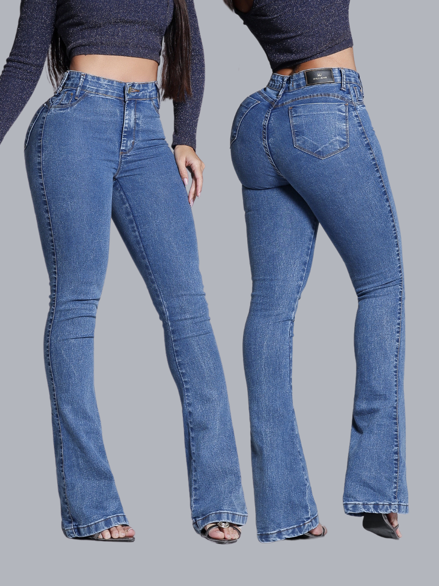 CALÇA FLARE JEANS FEMININA com detalhes cintura alta lenvanta bumbum