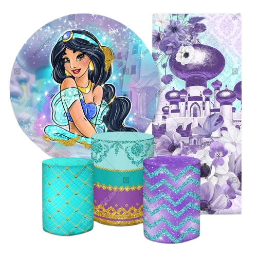 Kit Painel de Festa Princesa Jasmine Aladdin - 1 Redondo 1,5 + 1 Vertical 2x1 + 3 Capas Cilindro