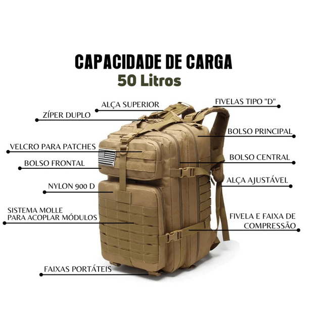 Mochila 50 Litros + 1 PATCH Tática Militar Camuflada Exército Camping viagem Resistente a Água