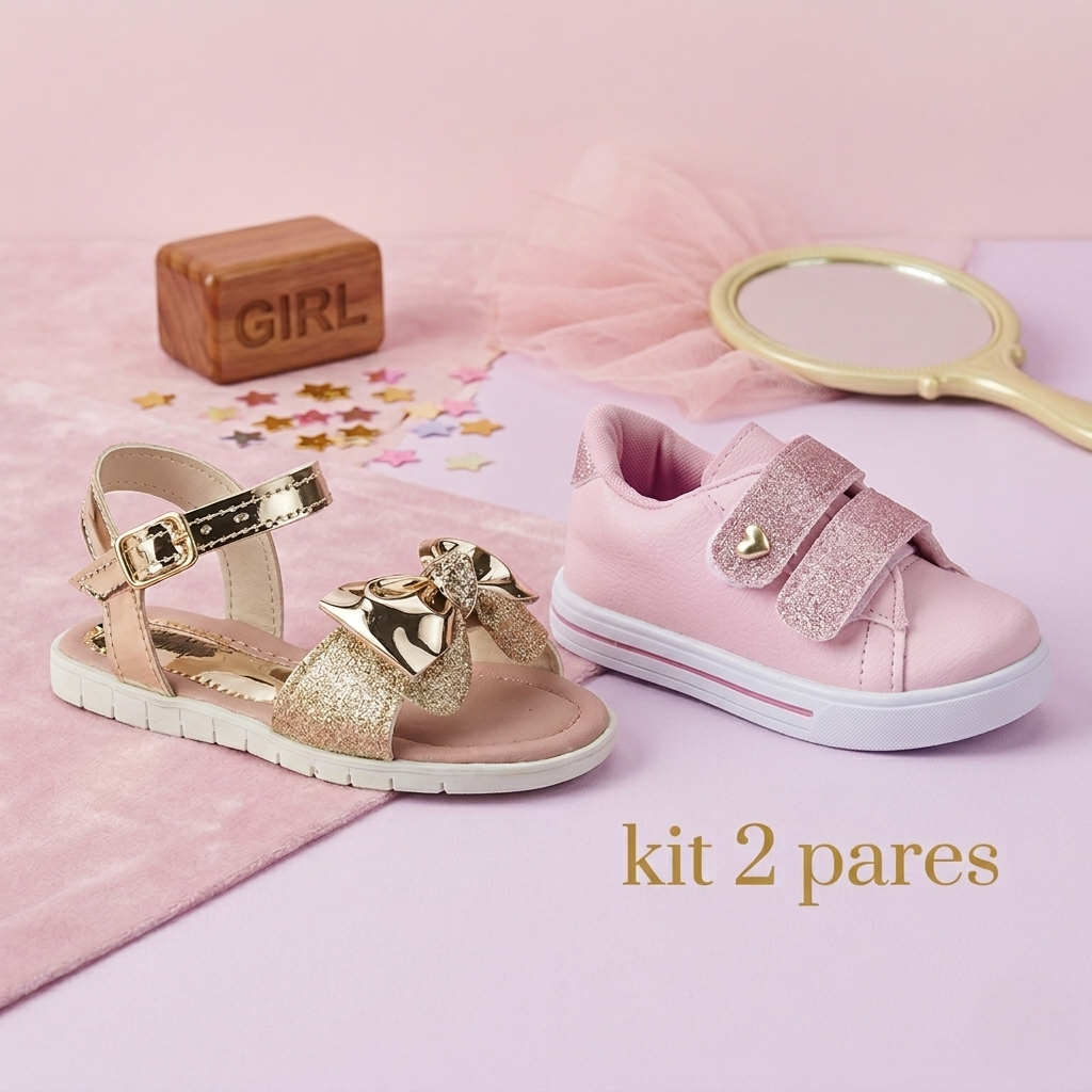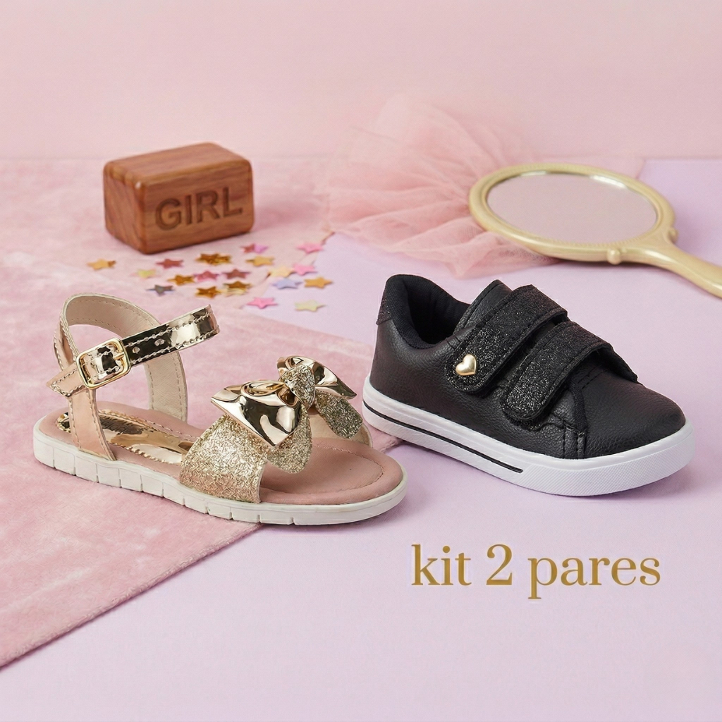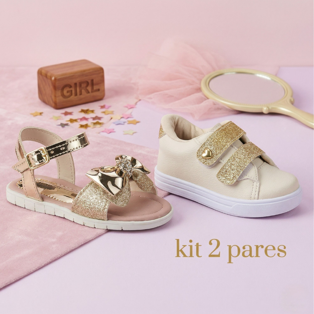 Kit 2 Pares Sandália Glitter Dourada e Tênis Menina Infantil Antiderrapante Confortável Casual Estiloso