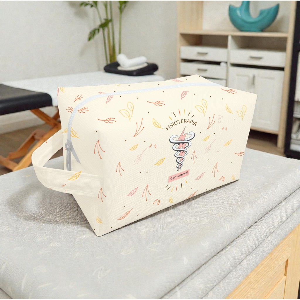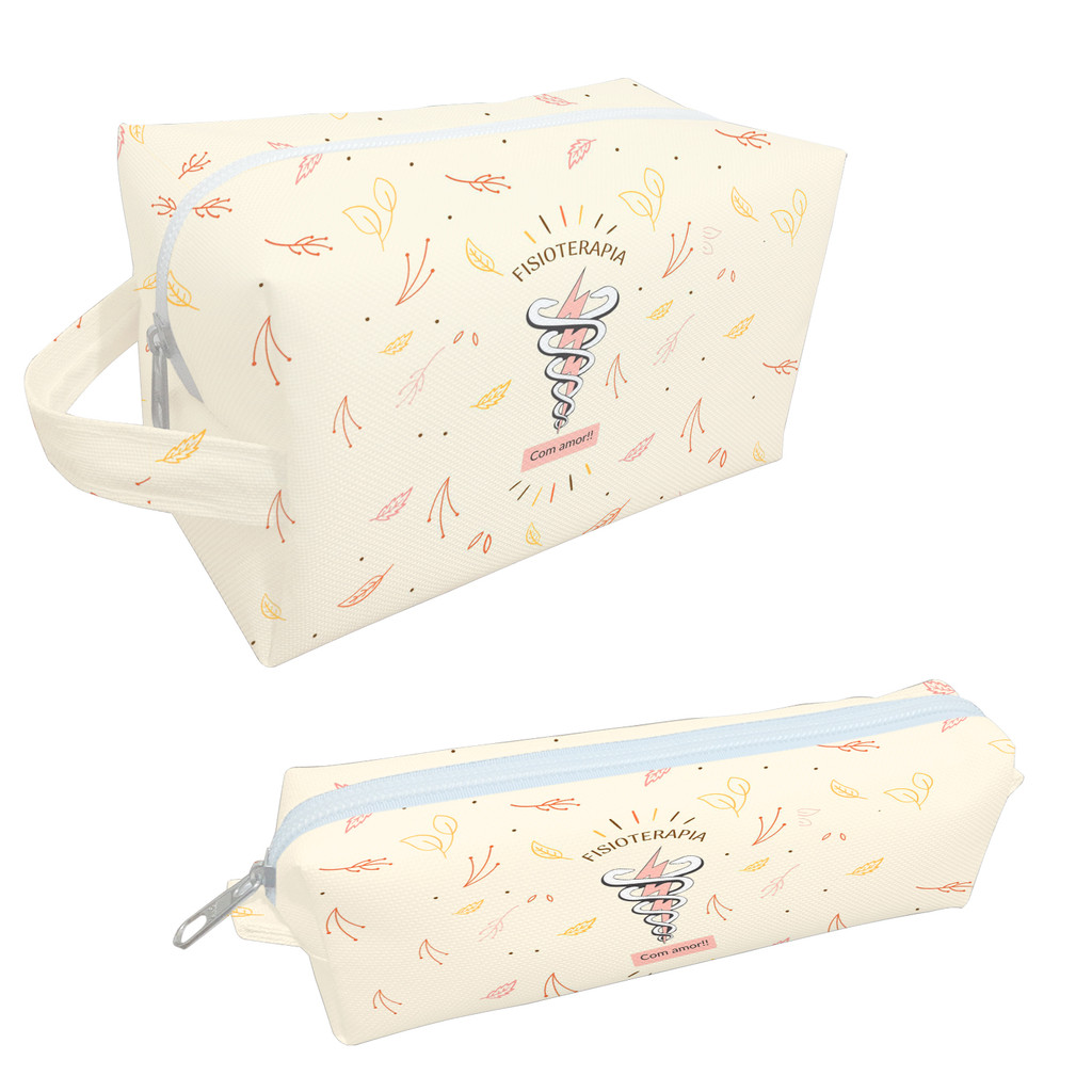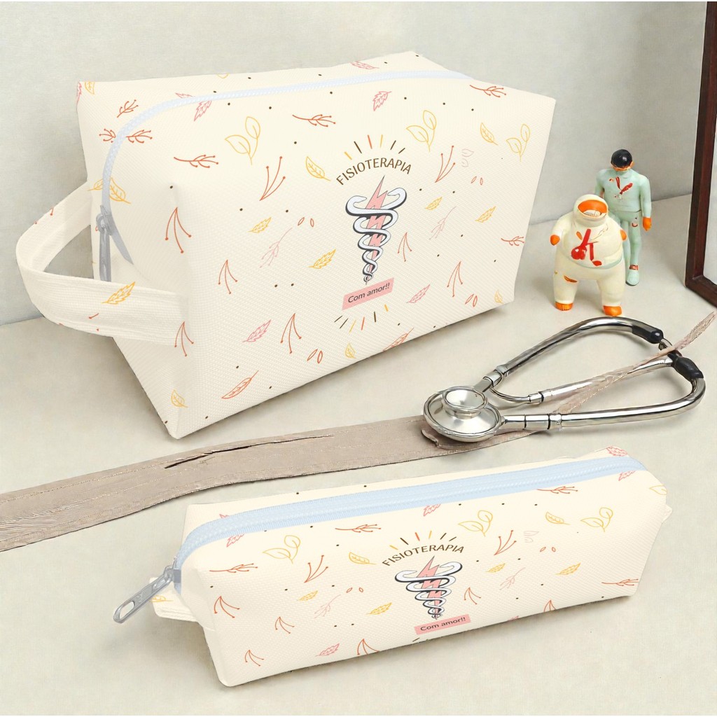 Necessaire Fisioterapia Bege Estojo Organizadora Bolsinha Estampa Profissões Saúde Símbolo Raio Folhas