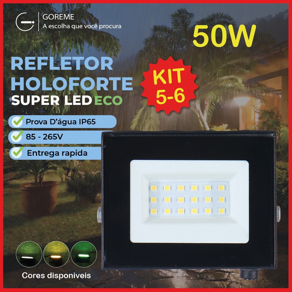 6 Holofote Refletor Led ECO Pro 50W Branco Frio 6500K Branco Quente Verde| IP65 | Luz Econômica | Para Jardim
