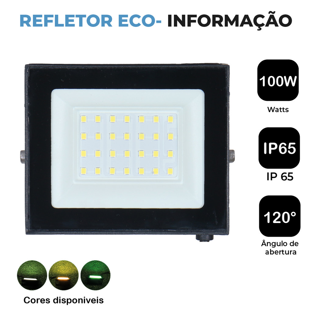 6 Holofote Refletor Led ECO Pro 100W Branco Frio 6500K Branco Quente Verde| IP65 | Luz Econômica | Para Jardim