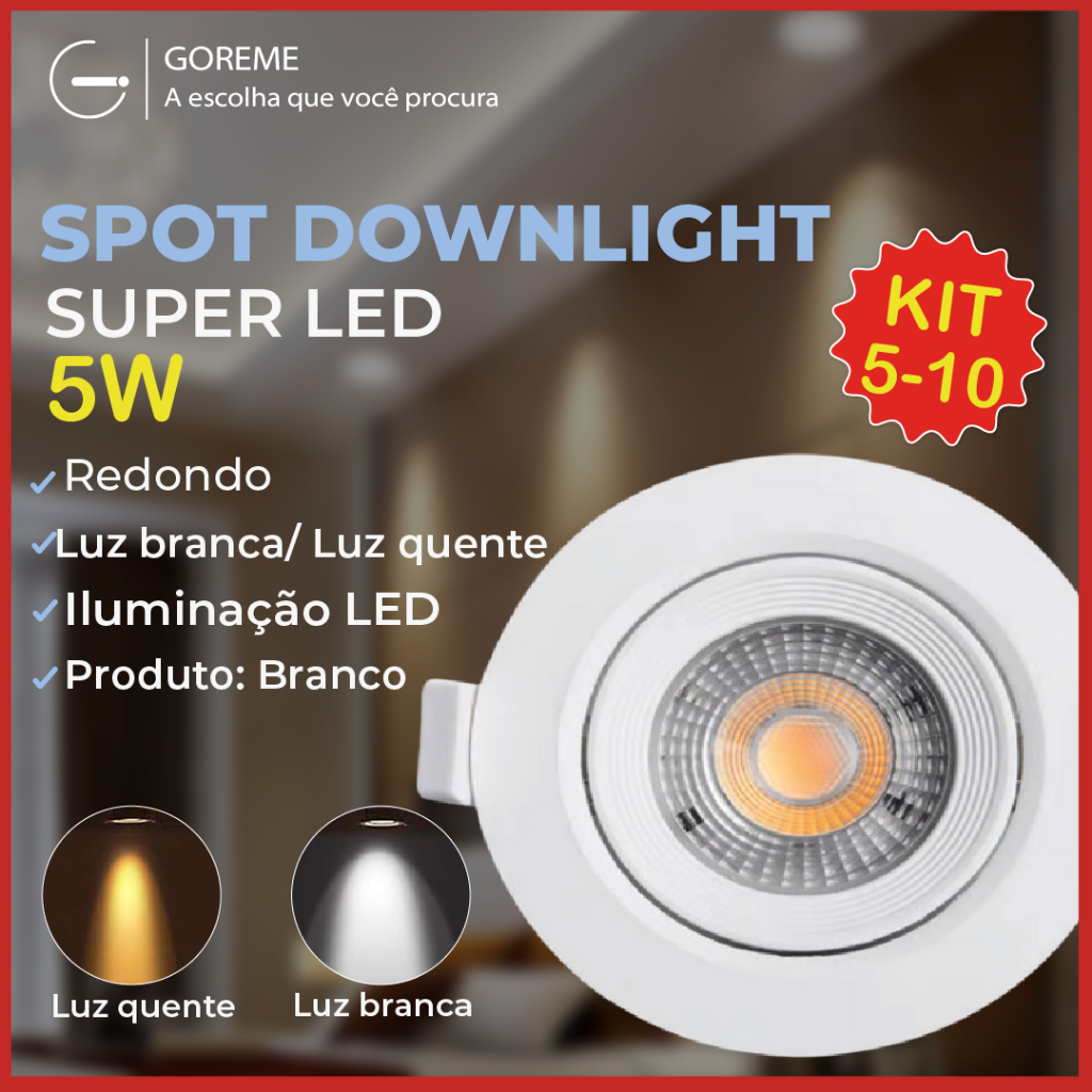 Kit 10 Luminária Spot Led Redondo Direcionável 5W Embutir Gesso Teto | Luz Fria ou Quente Bivolt