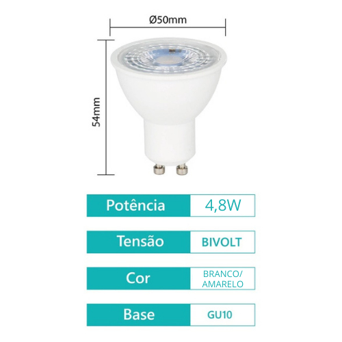 Kit 5 Lâmpada Led Dicroica Gu10 Mr16 4,8w Bivolt Luz Branca/Amarela