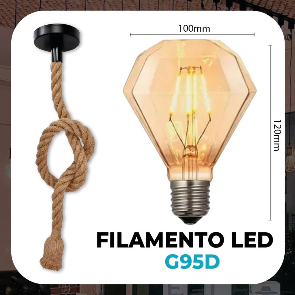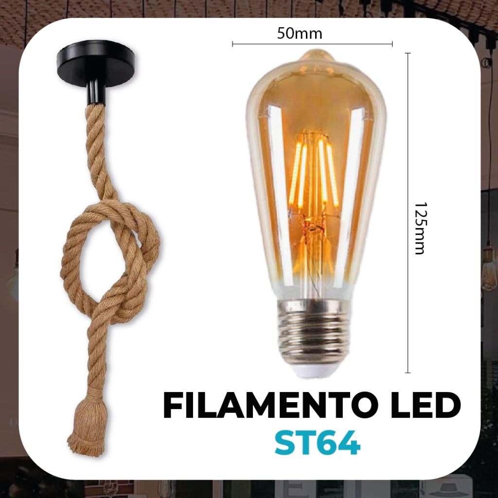 Pendente Corda + Filamento LED 1M Retro Vintage Rústico Sisal E27 Para Decoração Com Detalhes Pérola Preta | Filamento ST64, G80, G95 , G125, G45 ou ST64