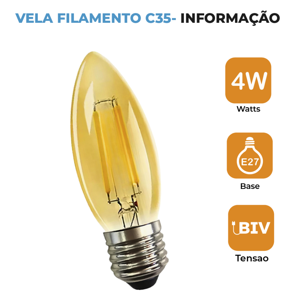Lâmpada Filamento Vela Led E27 Luz Quente C35 4W Amba Retro Vintage 2200K 110V-220V Bivolt
