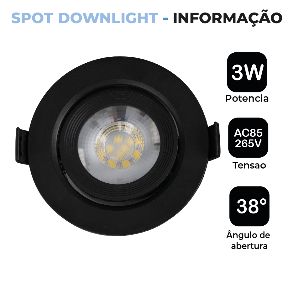 Luminária Spot Led Redondo Direcionável 3W Embutir Gesso Teto Preto |Luz Branca / Luz Amarela Bivolt Spot Super LED