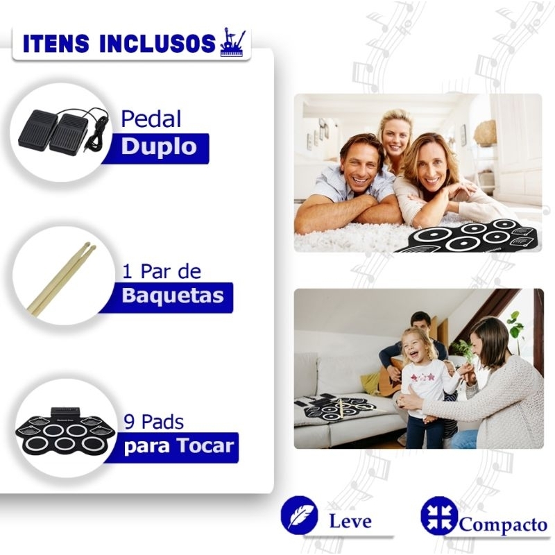 Bateria Eletrônica Musical 9 Pads 6 Drums 5 Metal 2 Pedais e 2 Baquetas