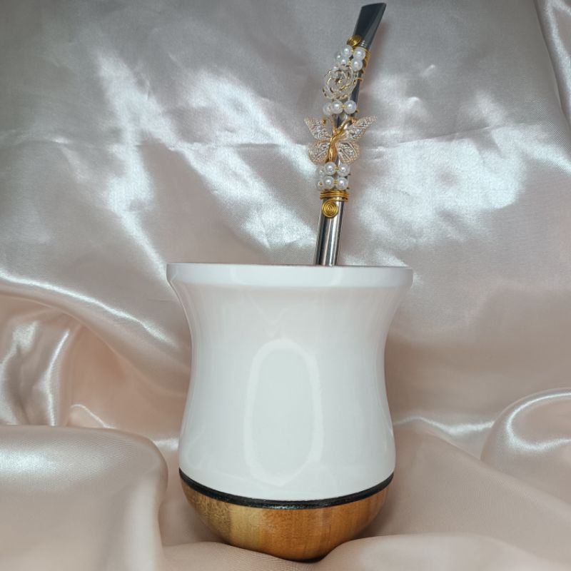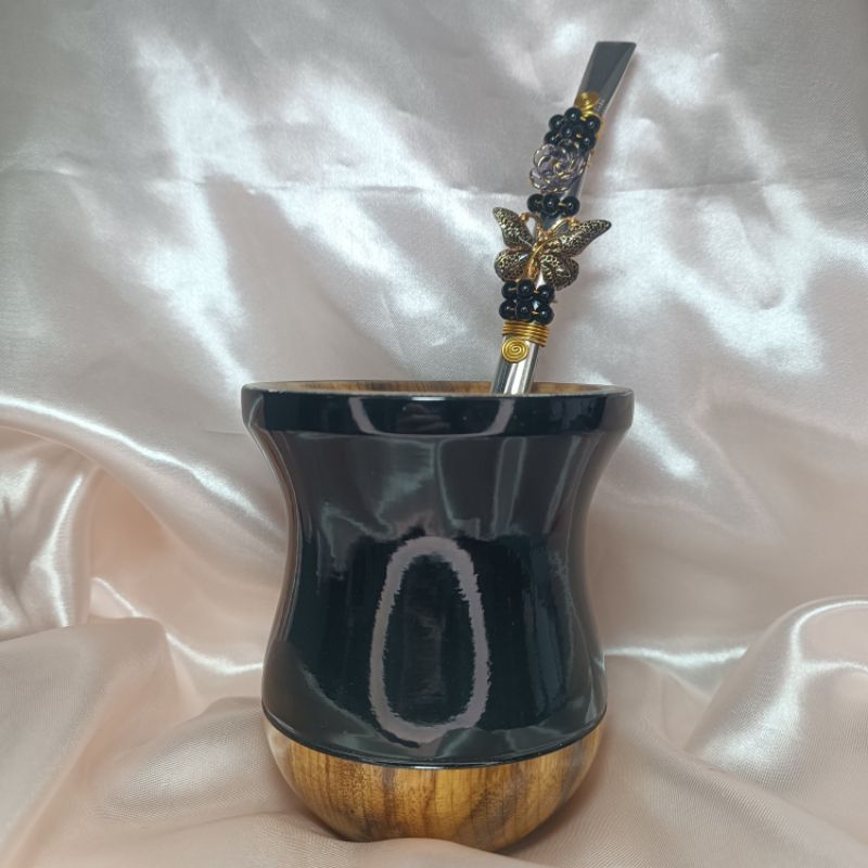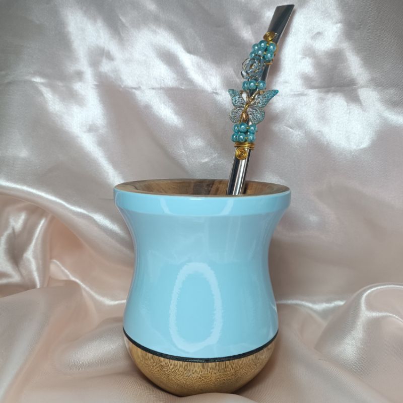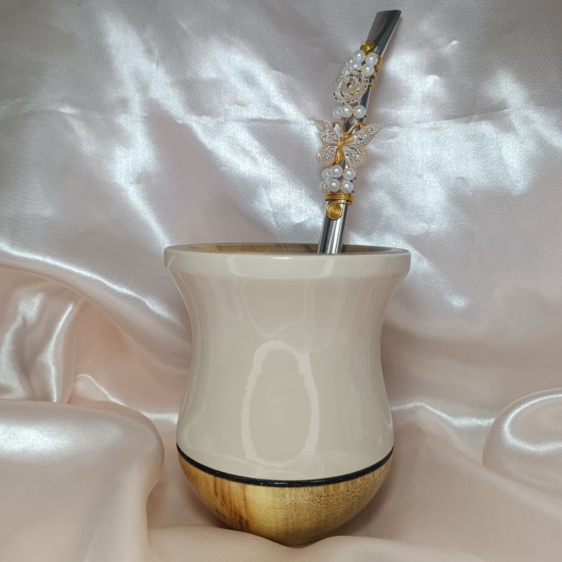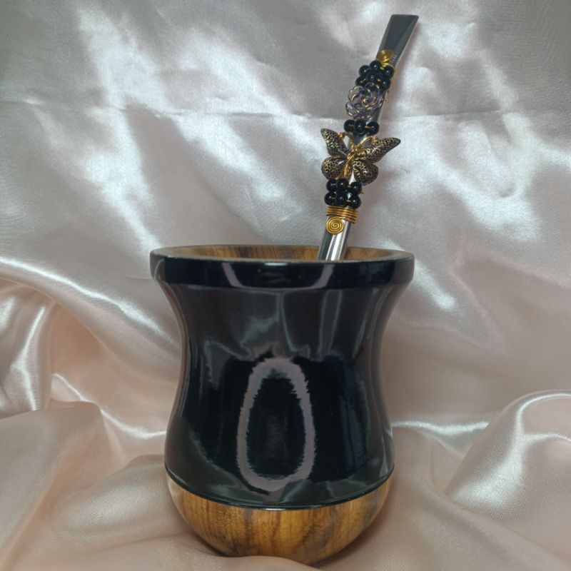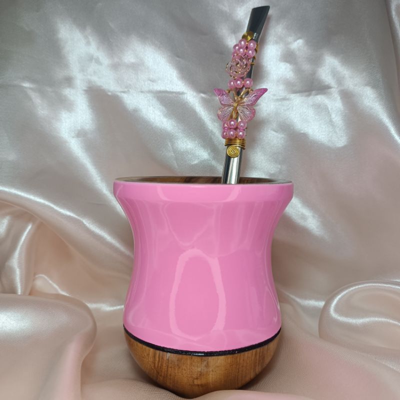 Kit Cuia de Madeira Chimarrão + Bomba Decorada Aço Inox