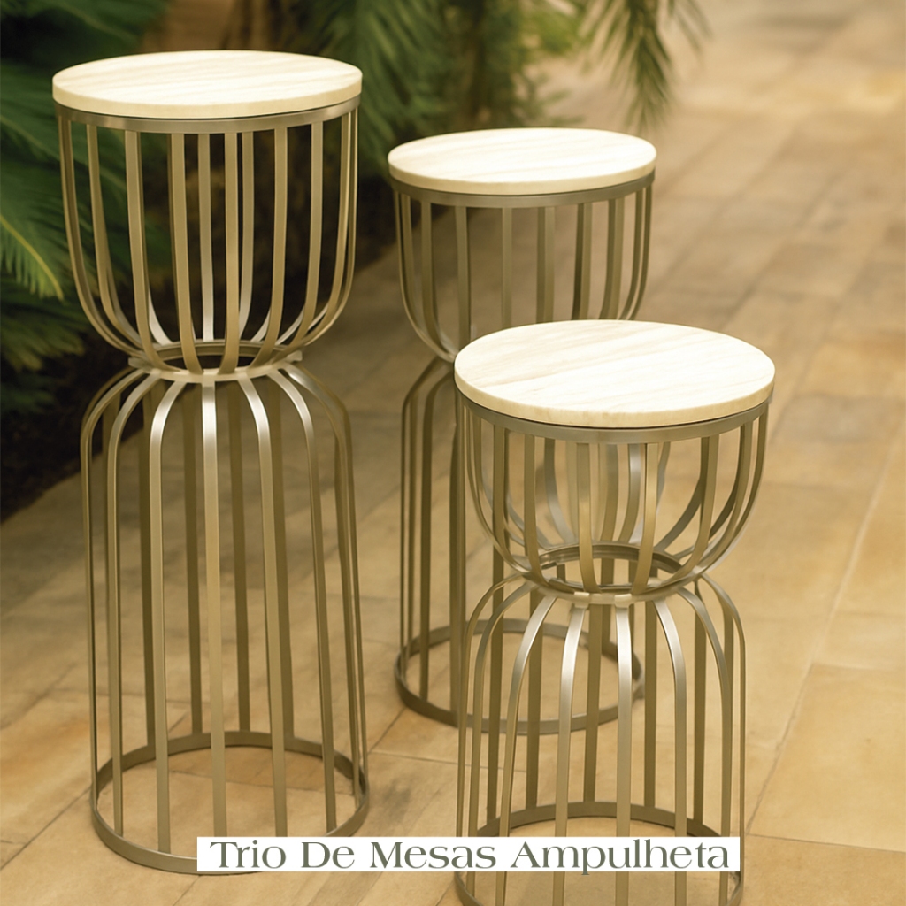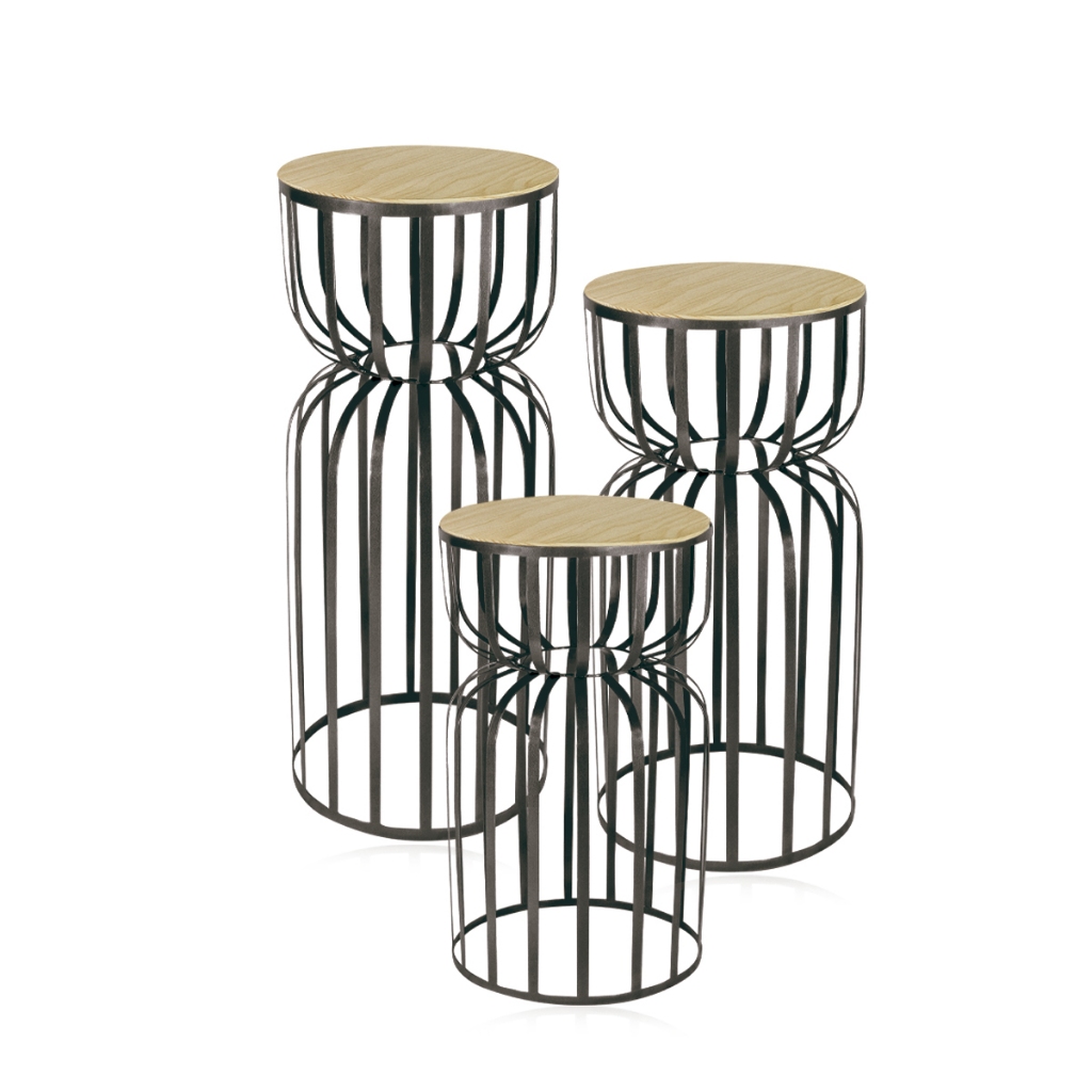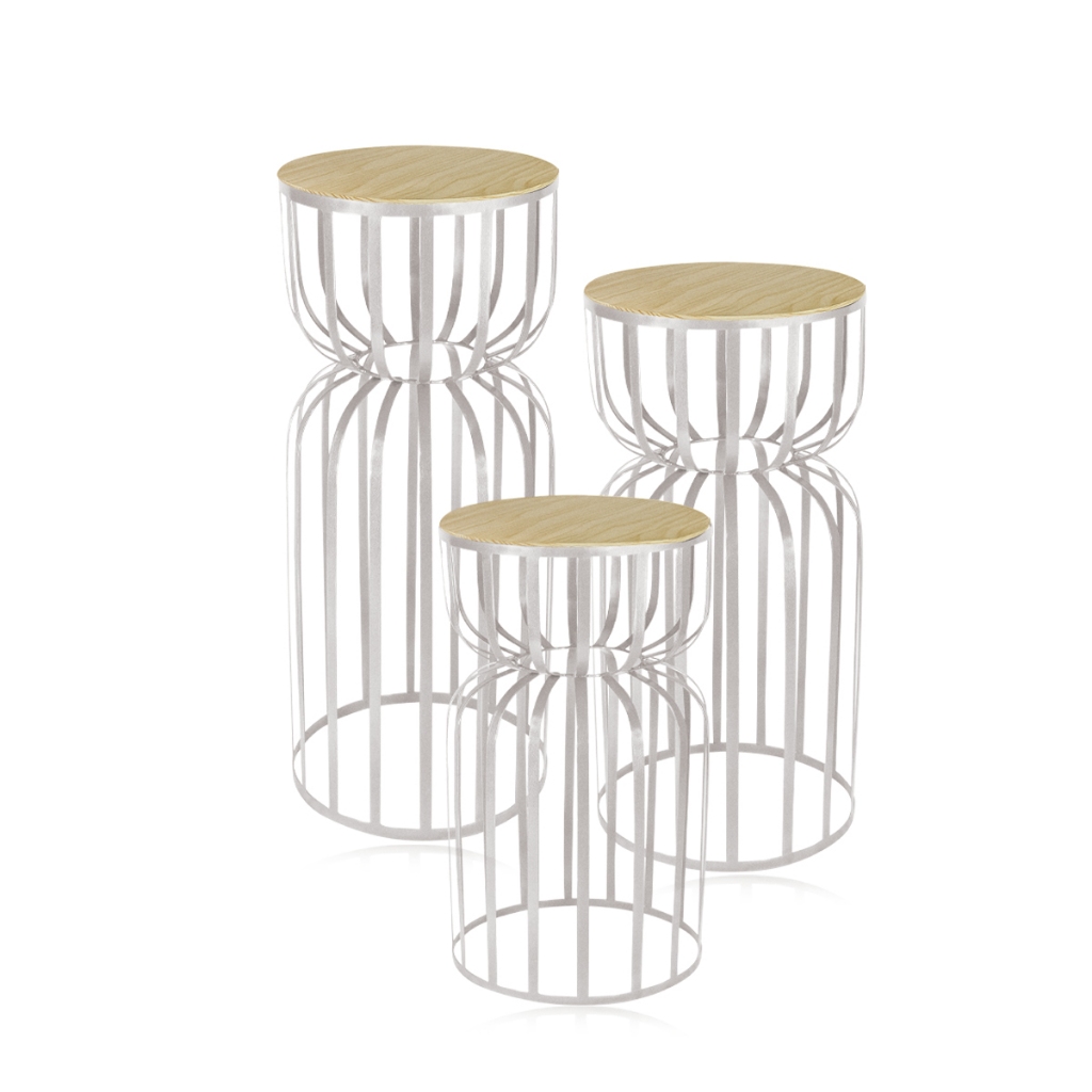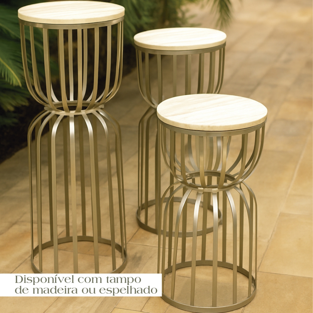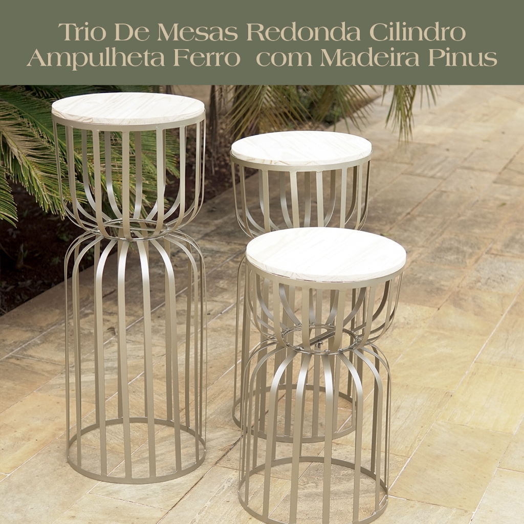 Kit Trio 3 Mesas Redonda Cilindro Ampulheta Desmontável Ferro com Tampo Madeira Pegue Monte Festas