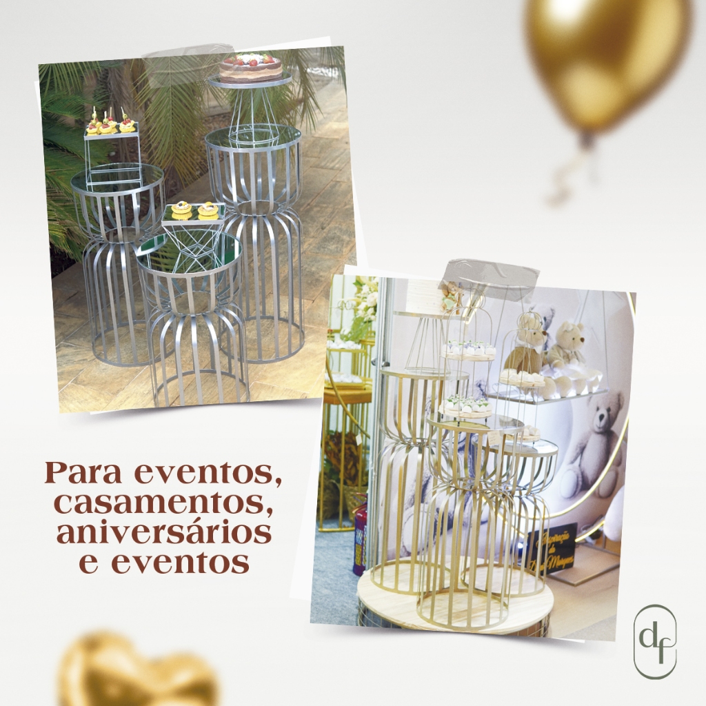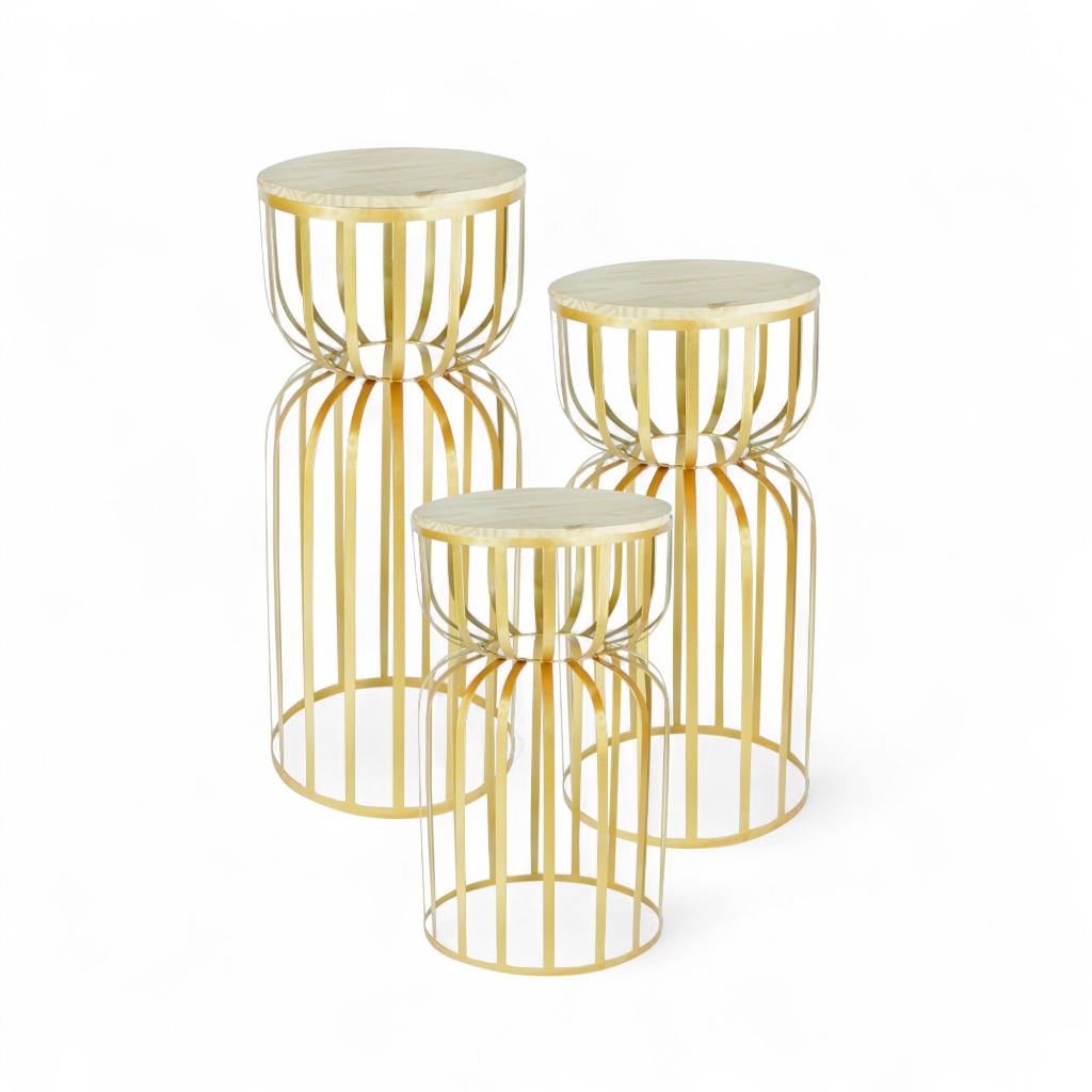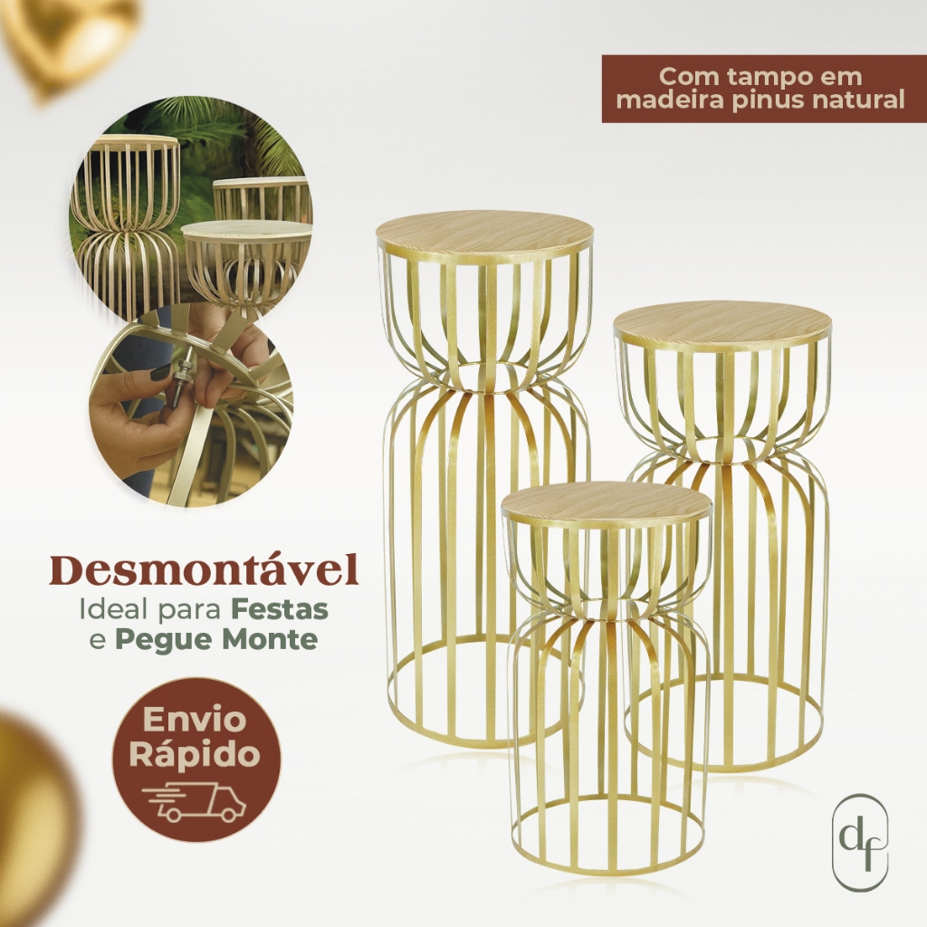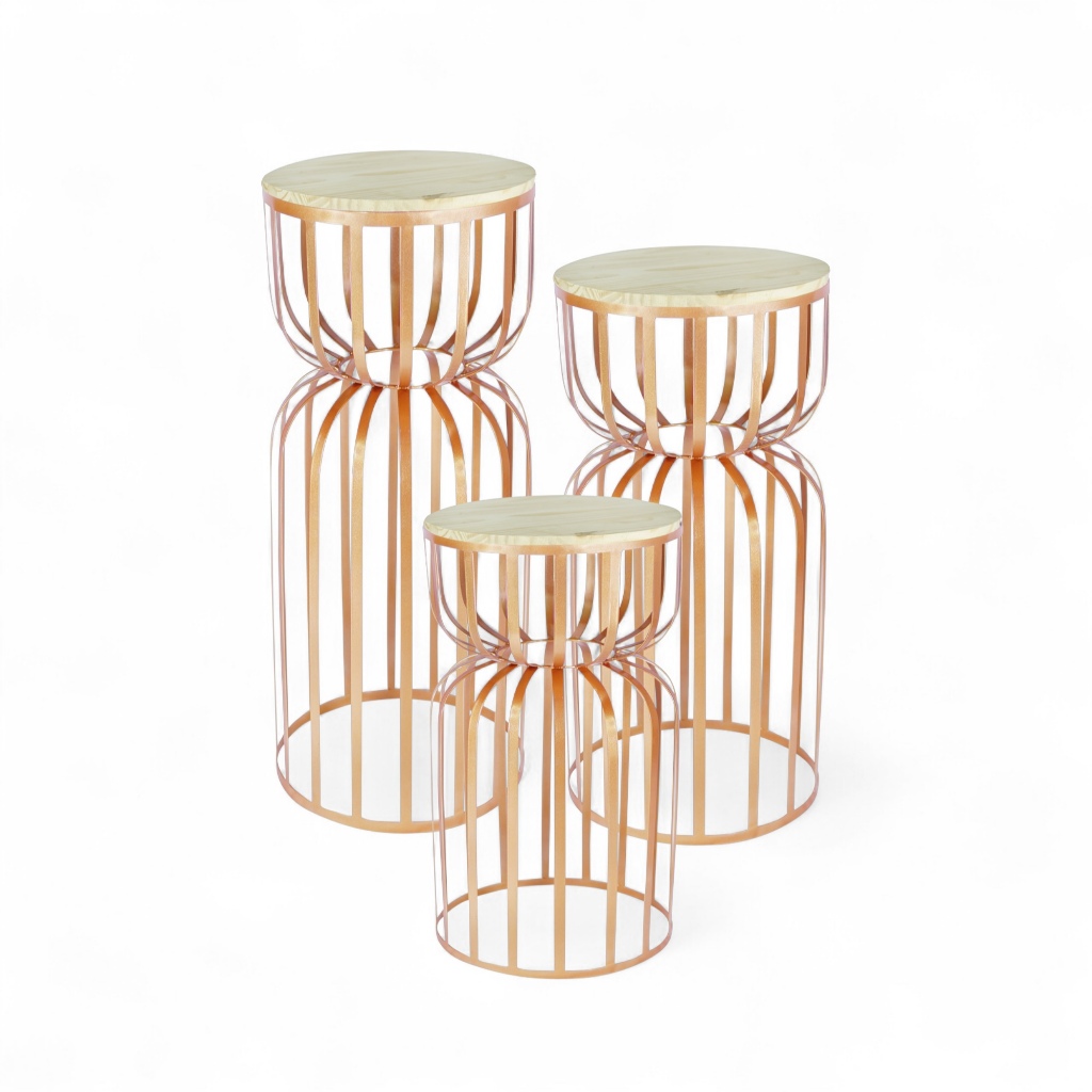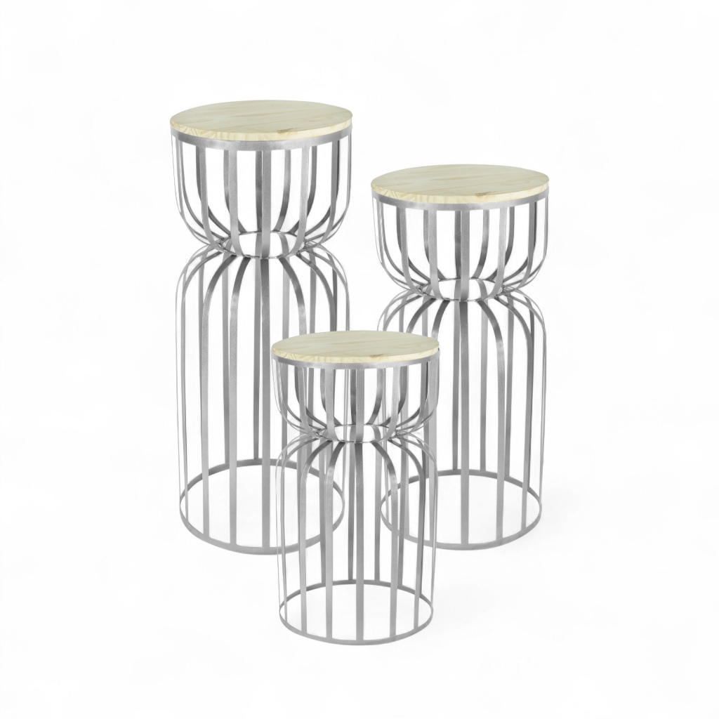 Kit Trio 3 Mesas Redonda Cilindro Ampulheta Desmontável Ferro com Tampo Madeira Pegue Monte Festas