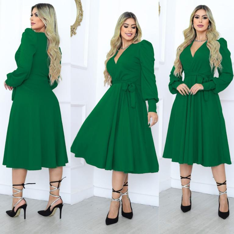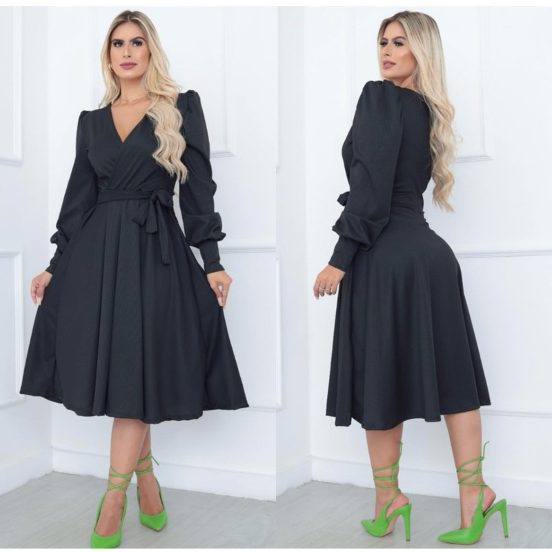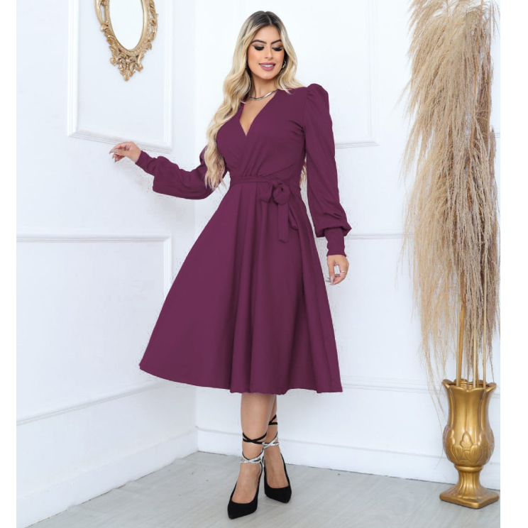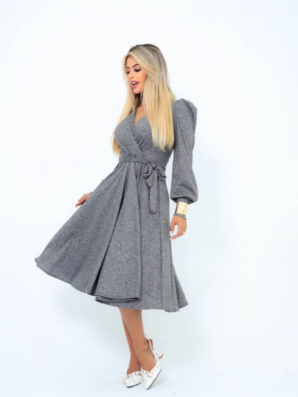 Vestido Midi Festa Cinza | Manga Longa Canelado | Elegante e Sofisticado | Saia Rodada com Cinto | Moda Feminina