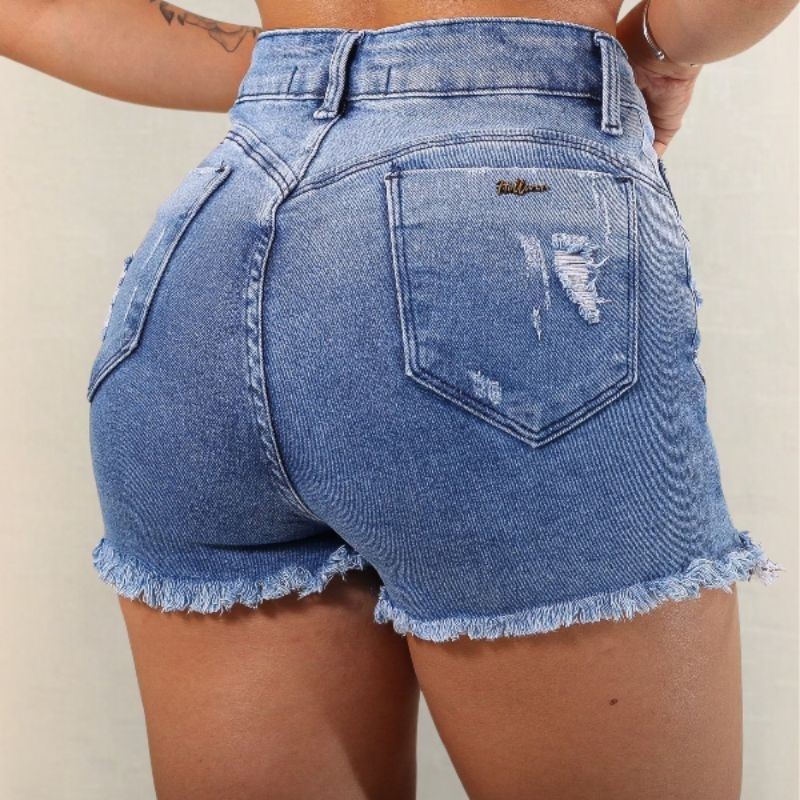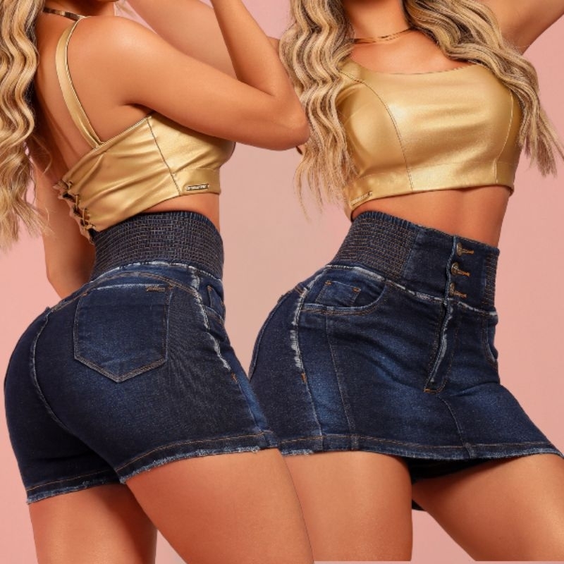 Short Saia Jeans Feminino Com LAYCRA Cintura Alta