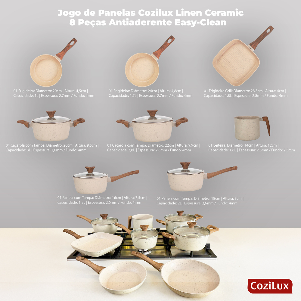 Jogo de Panelas Revestimento Cerâmico Antiaderente 8 Peças Cozilux Linen Ceramic