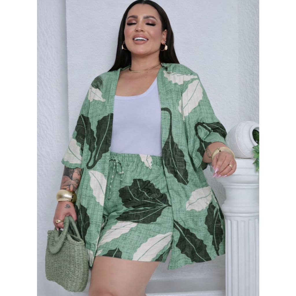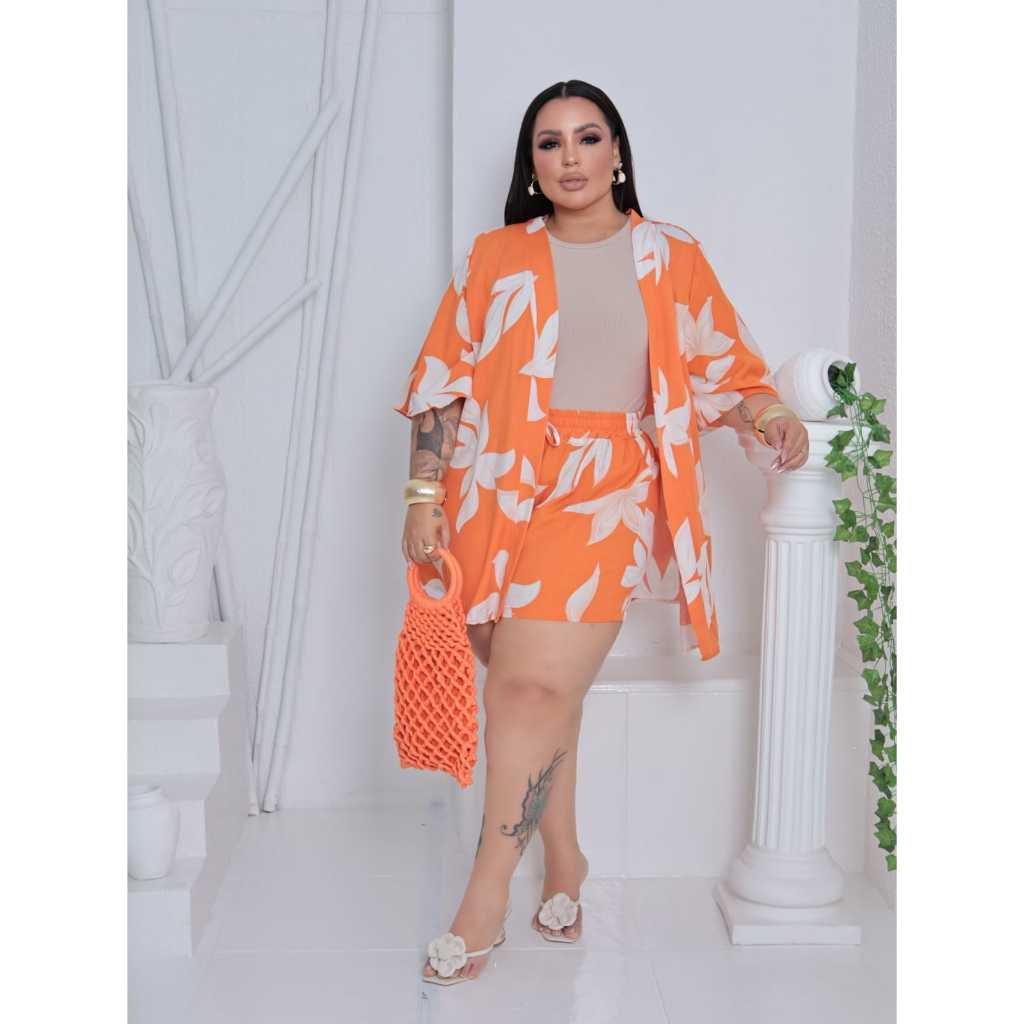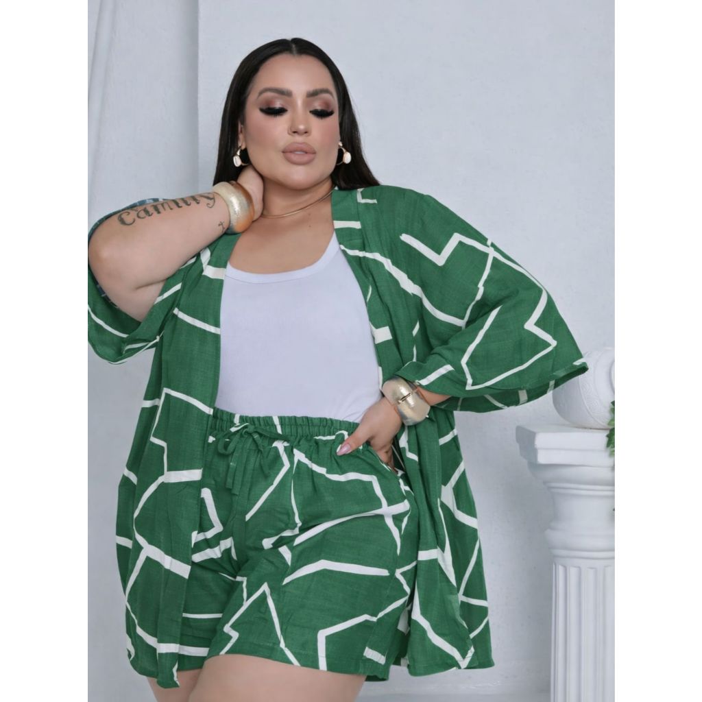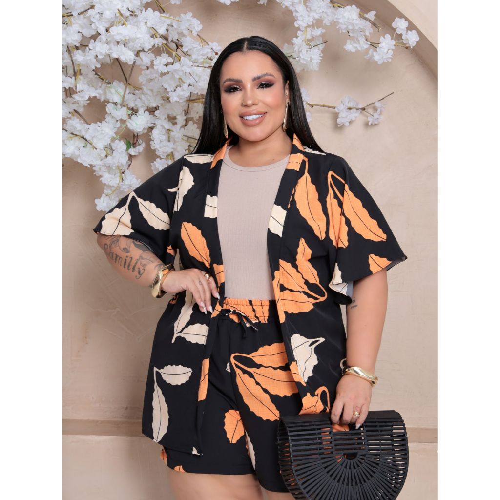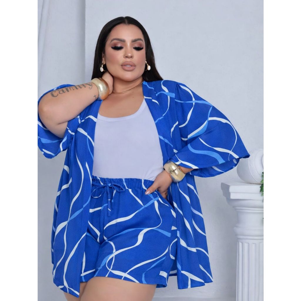 Conjunto Feminino Plus Size Camisa (Kimono) E Short Moda Blogueira