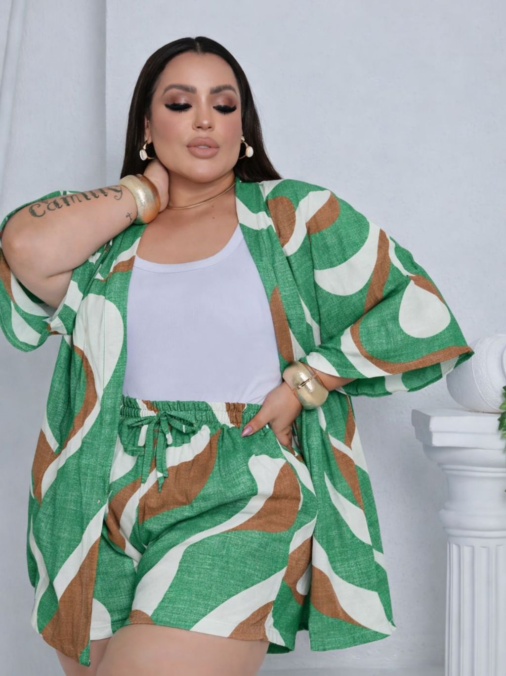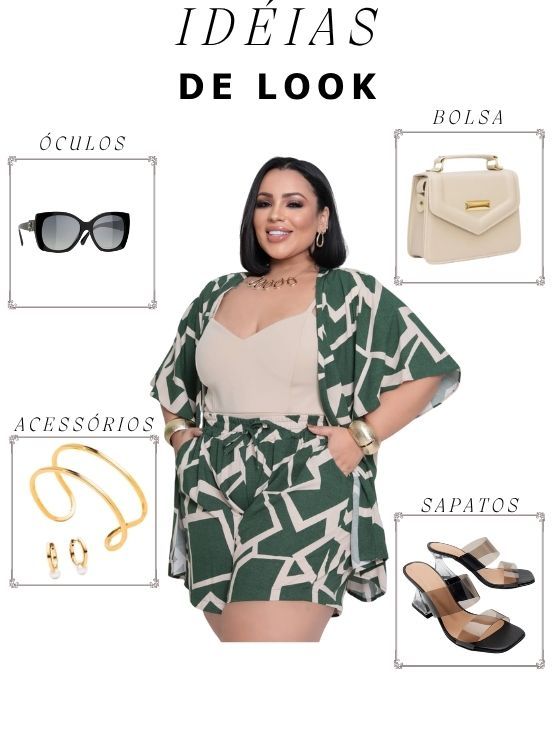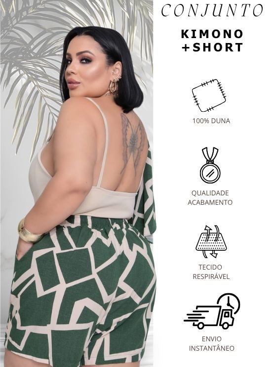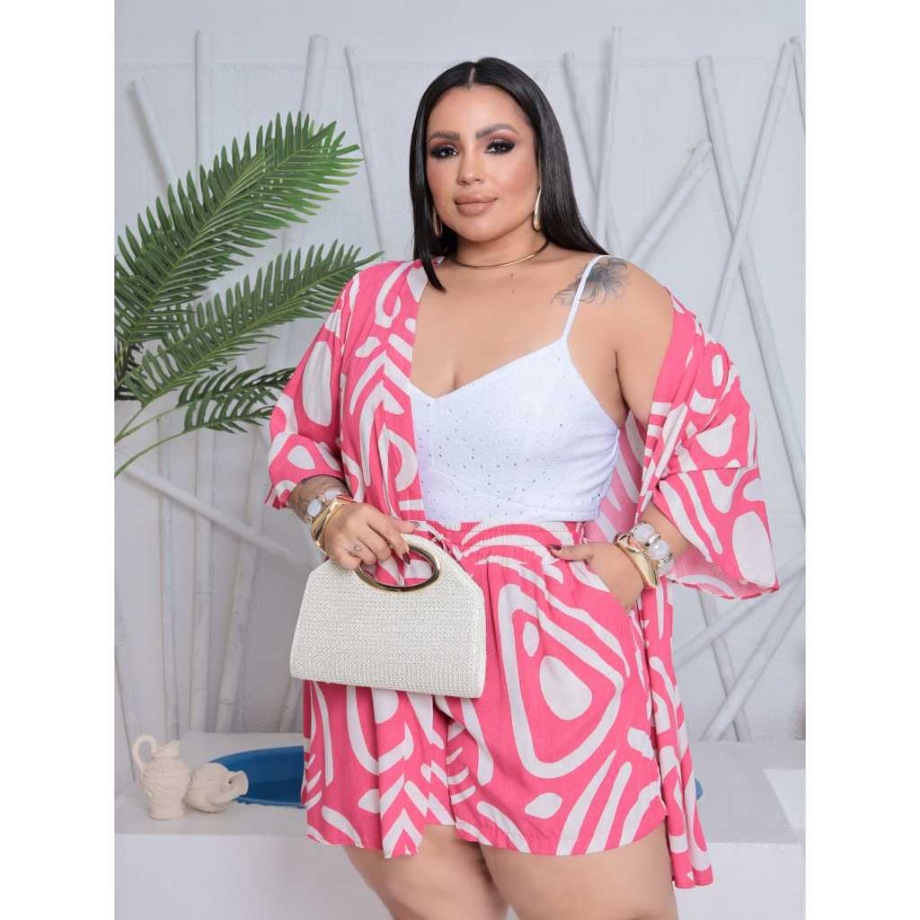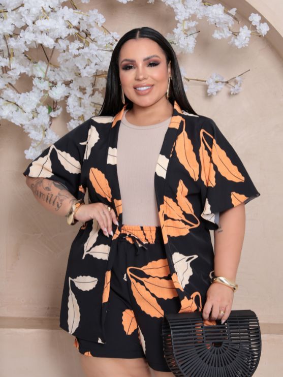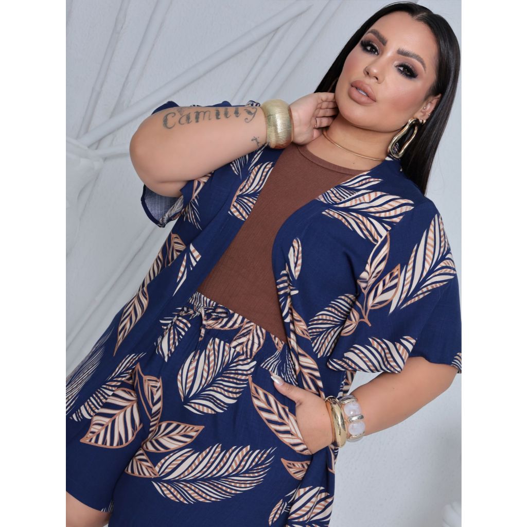 Conjunto Feminino Plus Size Camisa (Kimono) E Short Moda Blogueira
