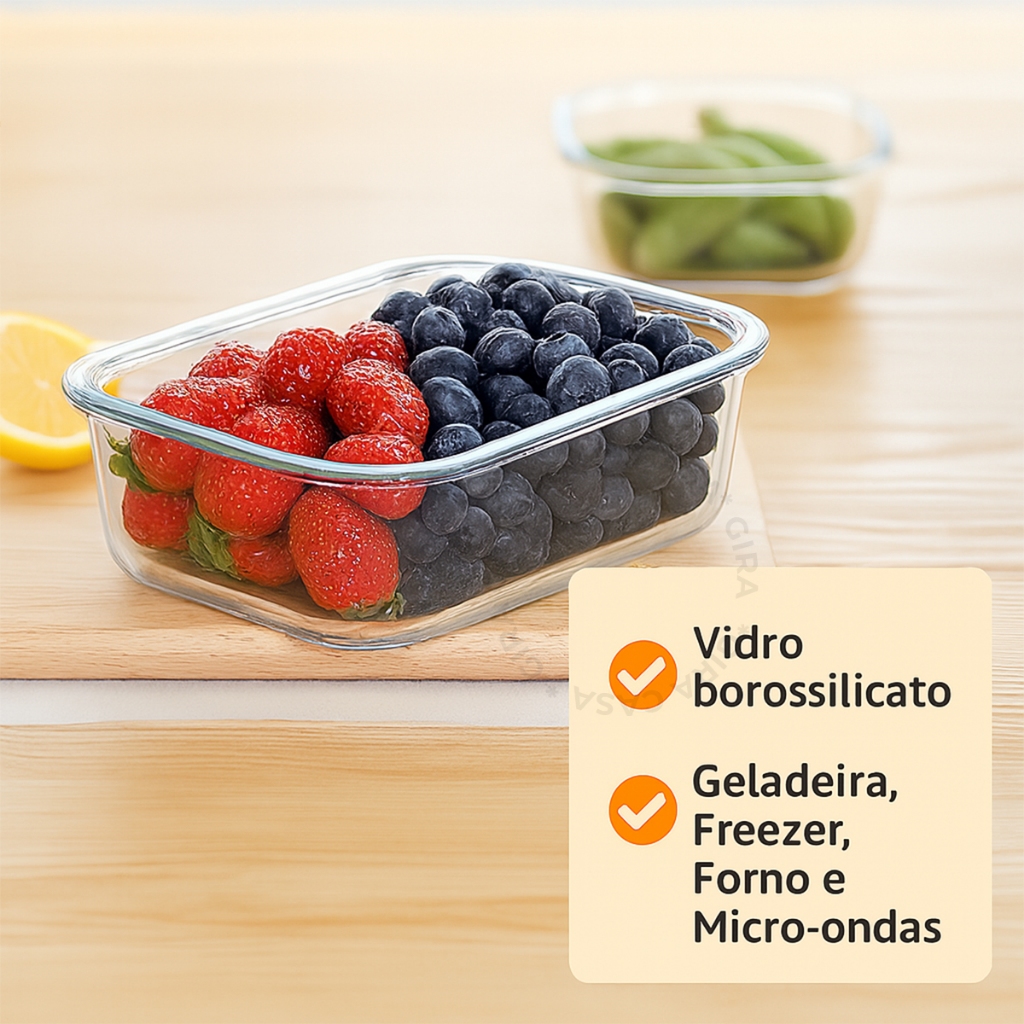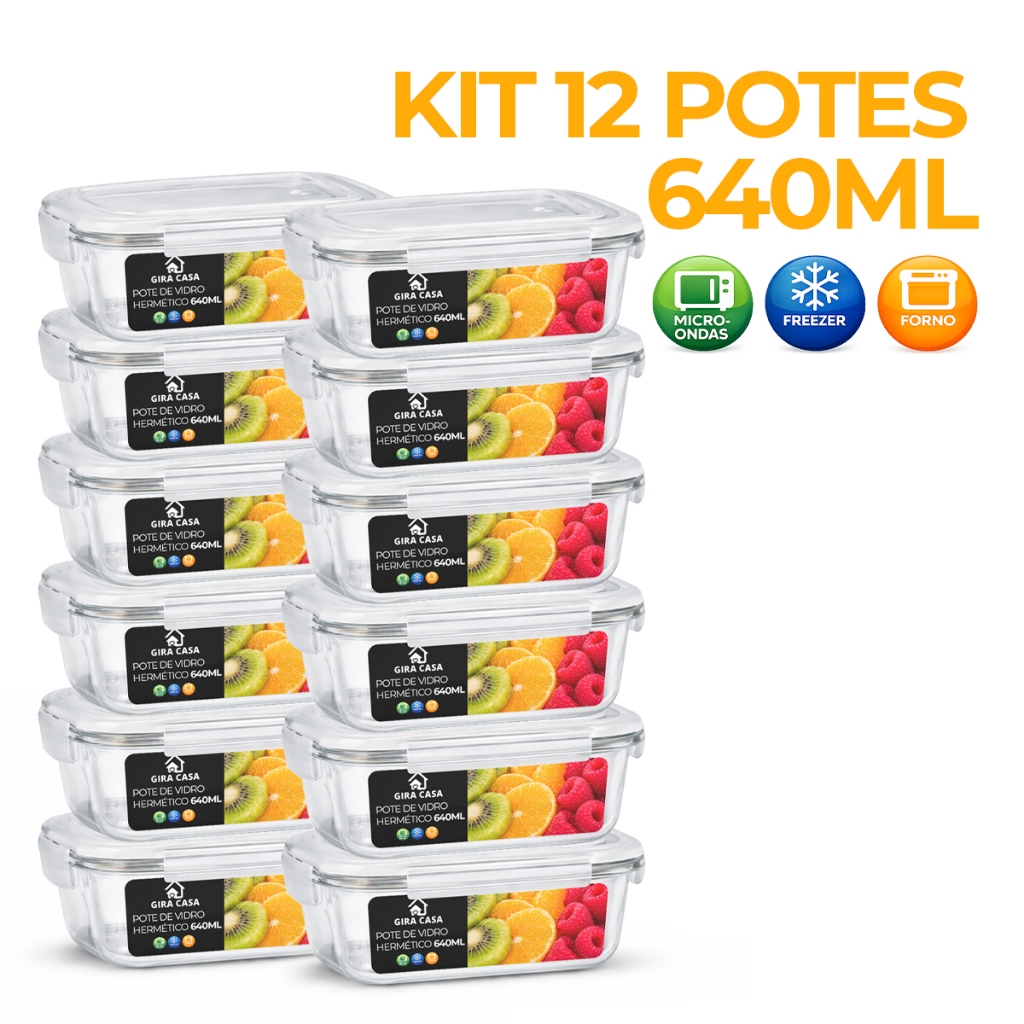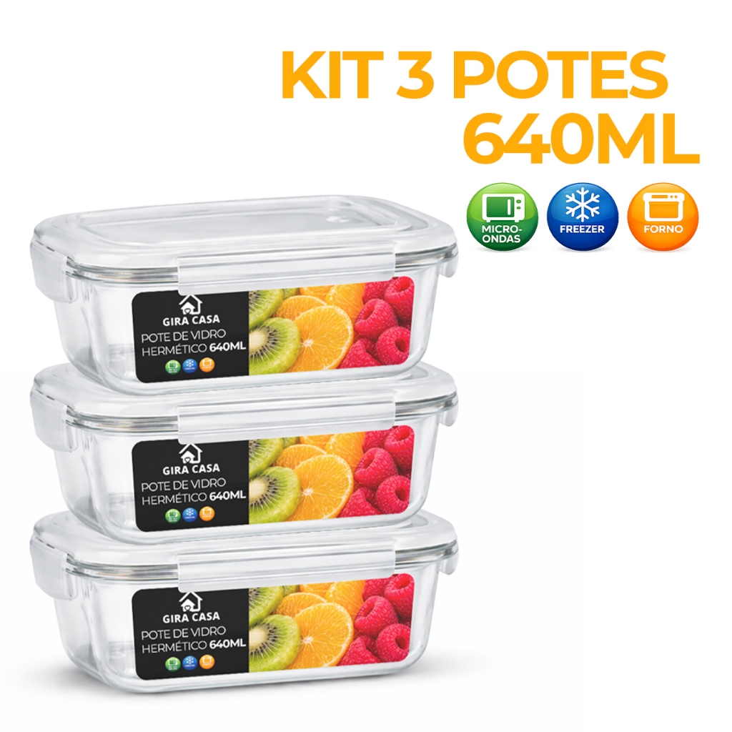 Kit 3/5/10 Potes de Vidro 640ml Hermético Marmita Fit com Tampa 4 Travas