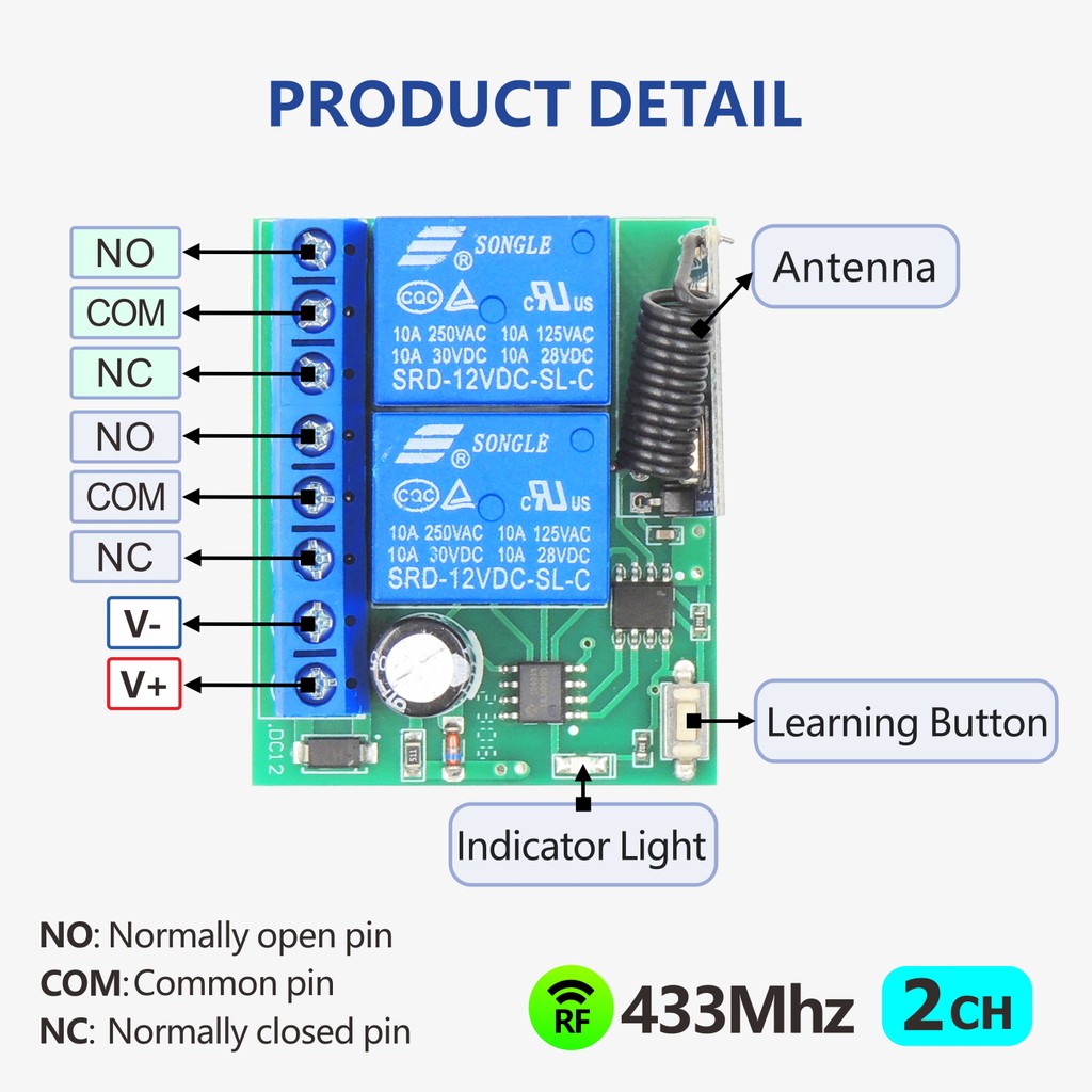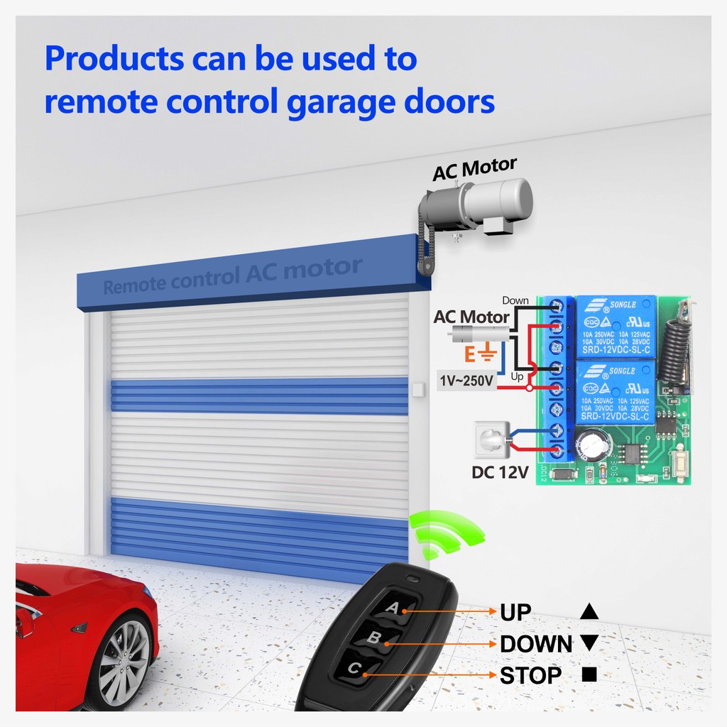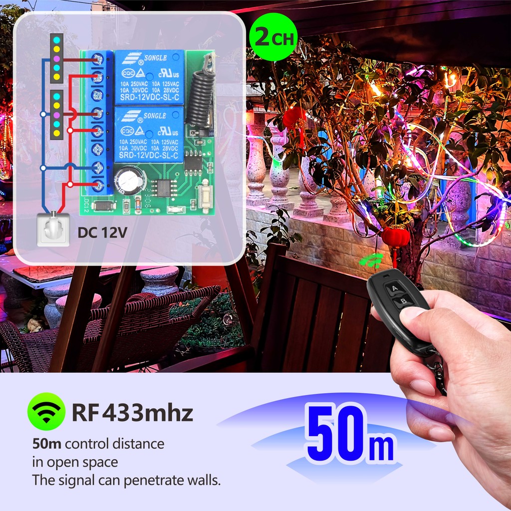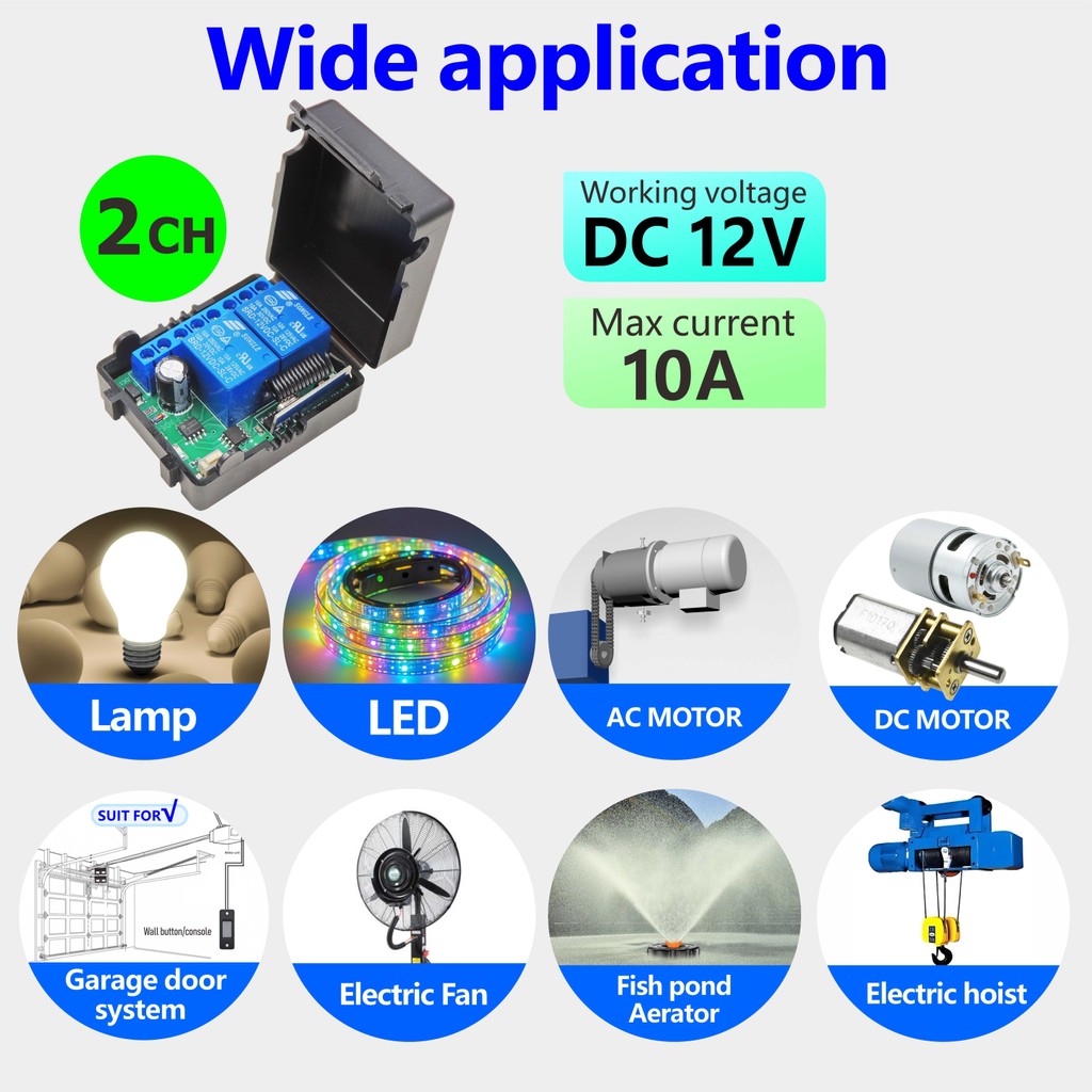 Interruptor de controle remoto sem fio RF 433MHz de 2 canais, relé DC 12 V para portas de garagem, motores, motocicleta