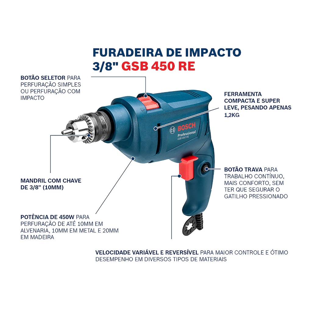 Furadeira De Impacto 3/8 10mm Gsb 450 Re Bosch Com Jogo De Brocas Bits 103 Profissional Peças