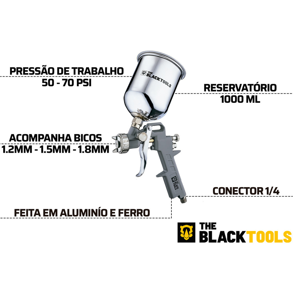 Pistola De Pintura De Gravidade 1l Com Bico 1.2 1.5 E 1.8mm The Black Tools