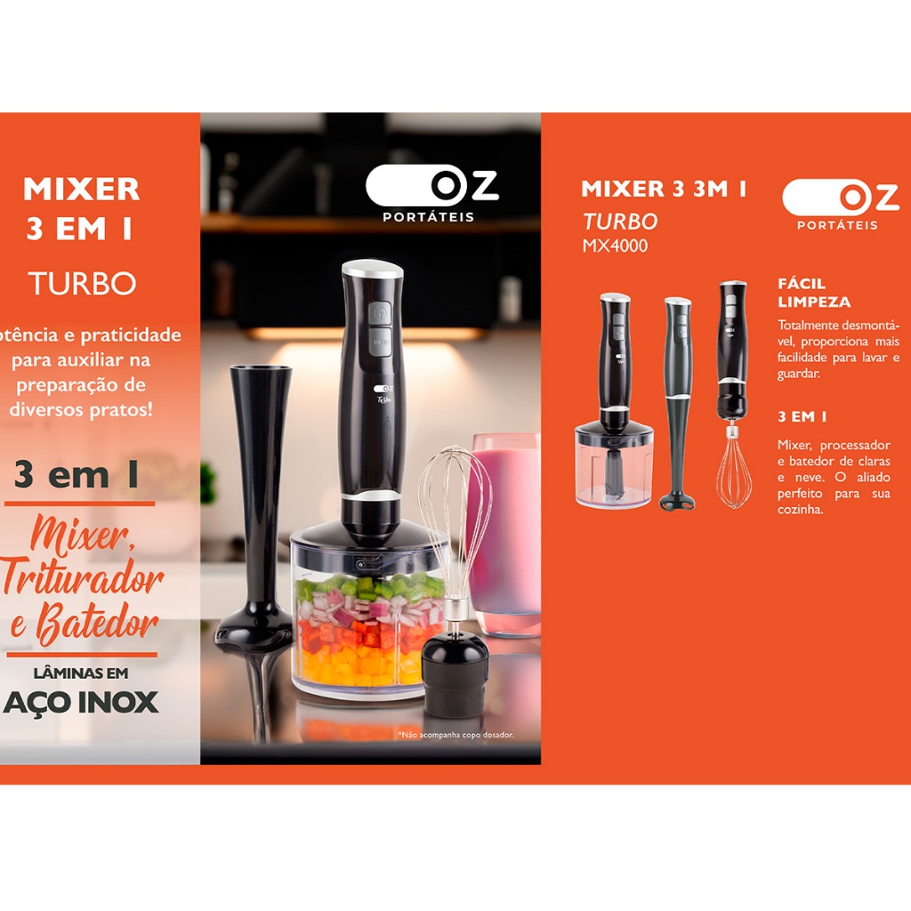 Mixer Turbo Chef 3 Em 1 250w Misturador Triturador E Fuet Sem Fio Portátil Mx4000 Oz