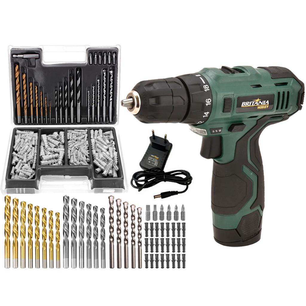 Parafusadeira Furadeira A Bateria 12V 3/8" 10mm C/ Acessórios + Jogo De Brocas Bits E Buchas Com Maleta