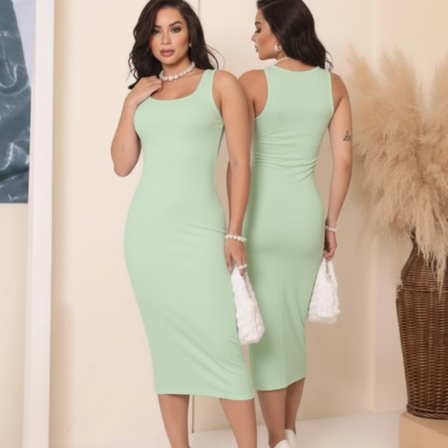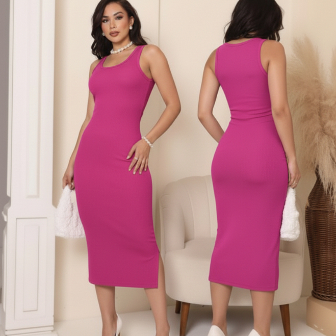 Vestido Midi Feminino Anarruga | Tecido que Estica, com Fenda Lateral e Corte Regata - Look Casual Chic