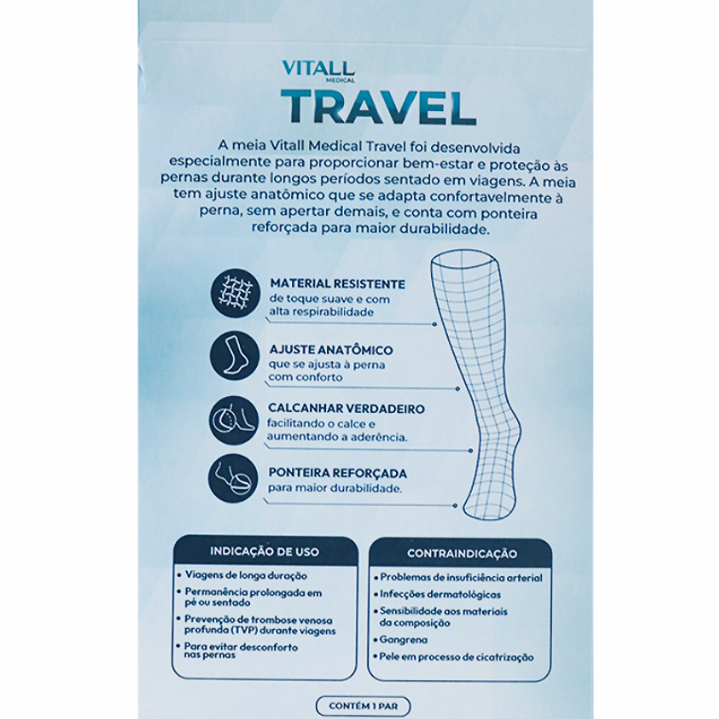 Meia Viagem de Avião Evita Trombose 3/4 Vitall Travel Com Ponteira Média Compressão Preta Unissex