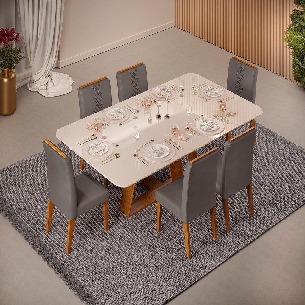 Conjunto de Sala de Jantar 6 Cadeiras Tampo Curvo Dj Moveis Kiara Freijo Yasmin Lunar