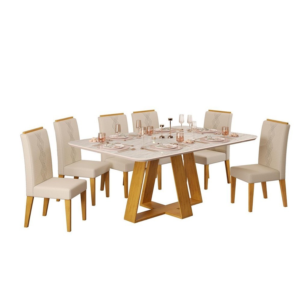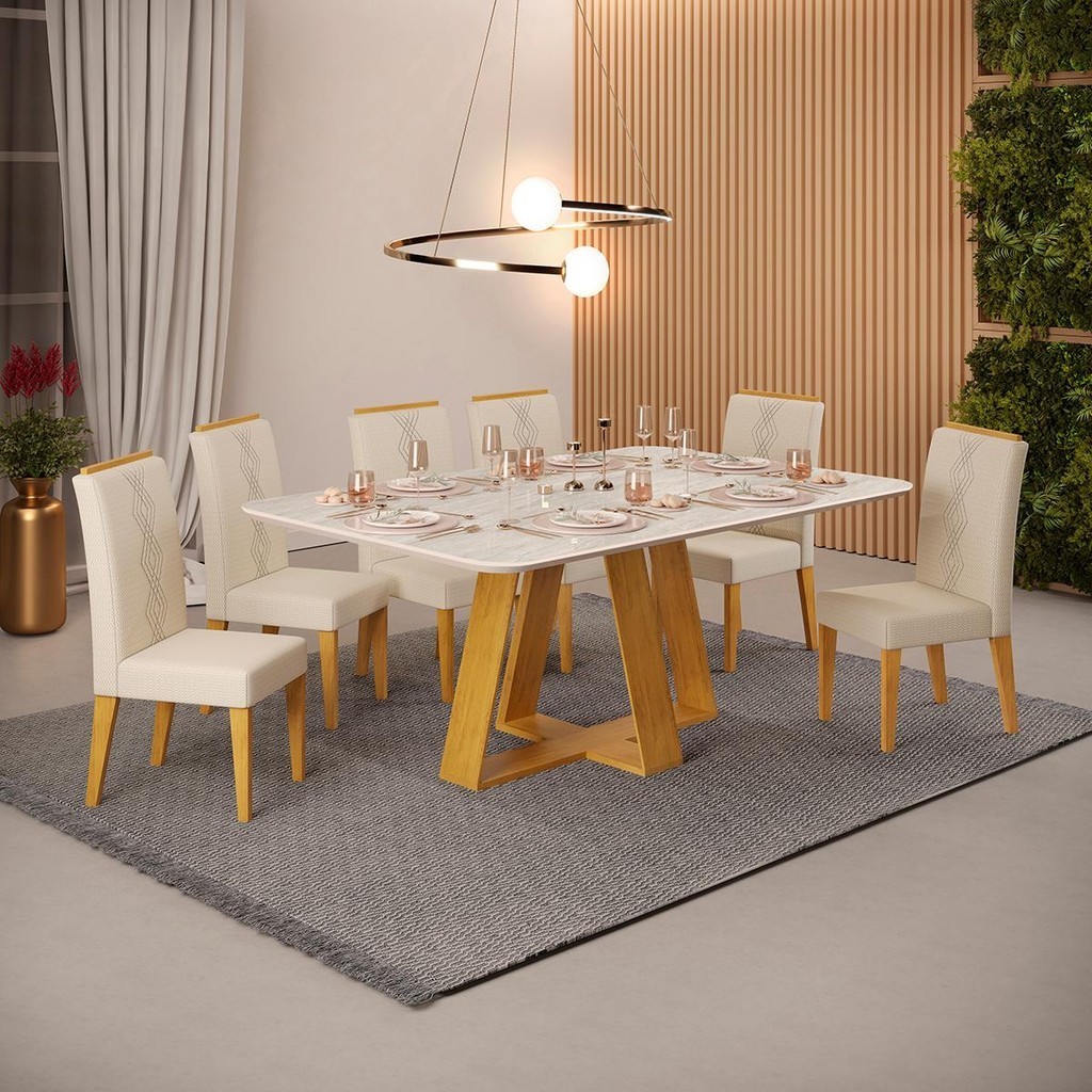 Conjunto Sala Jantar 6 Cadeiras Sem Vidro 170x90 DJ Móveis Kiara Cedro Quartzo Yasmin Linho Neve