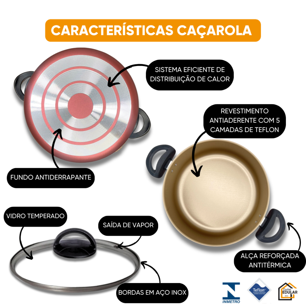 Panela Caçarola Plus 24 cm Grande 5 Camadas Antiaderente Teflon com Tampa de Vidro Cor Cereja Gold