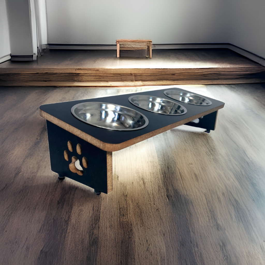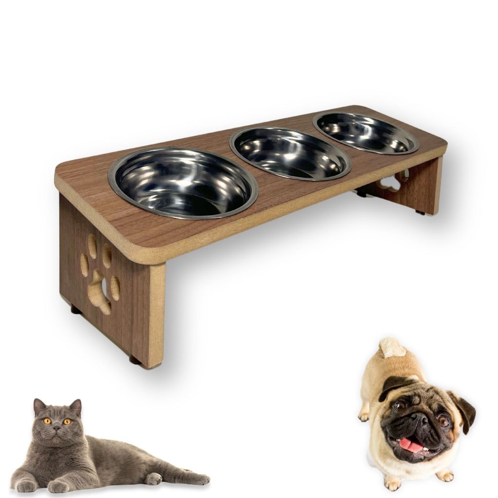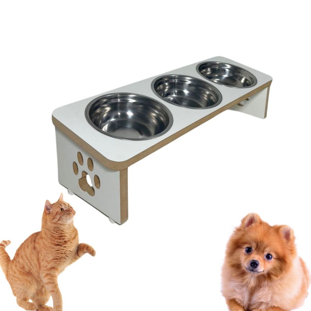 Comedouro Pet Elevado Inclinado 3 Tigelas de Inox em MDF premium super resistente