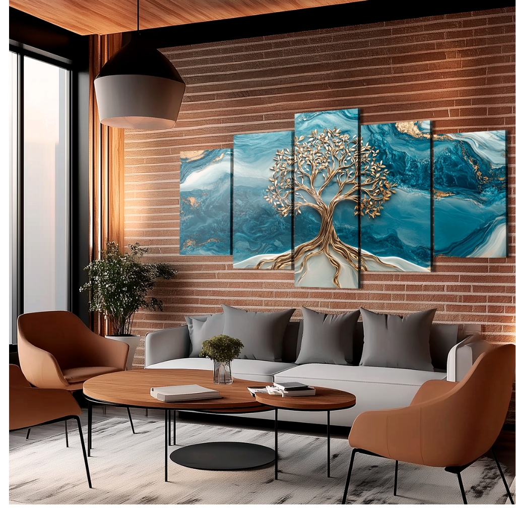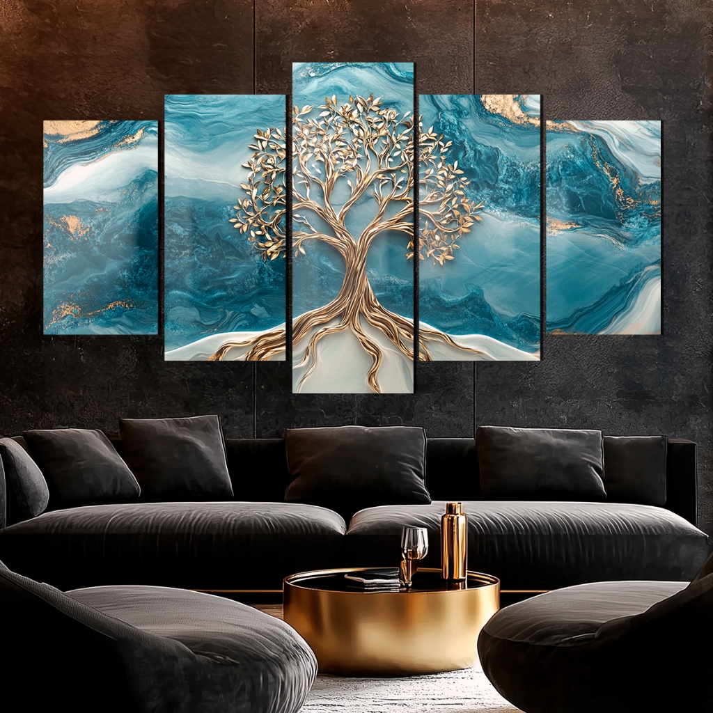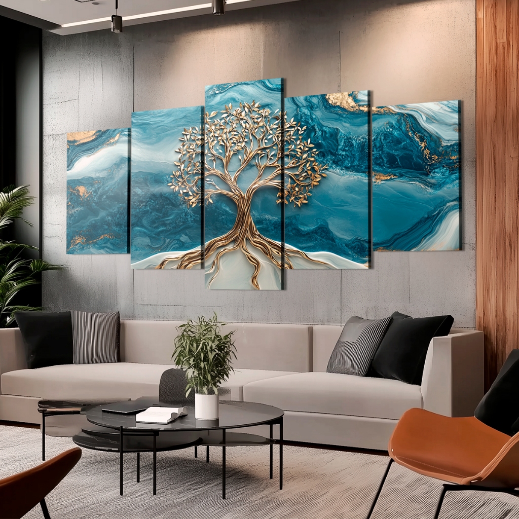Quadros Decorativo Árvore da Vida Dourada Marmorizado Azul Luxo para Sala Escritório