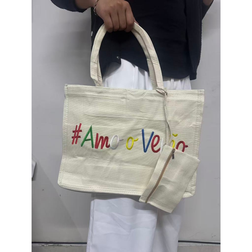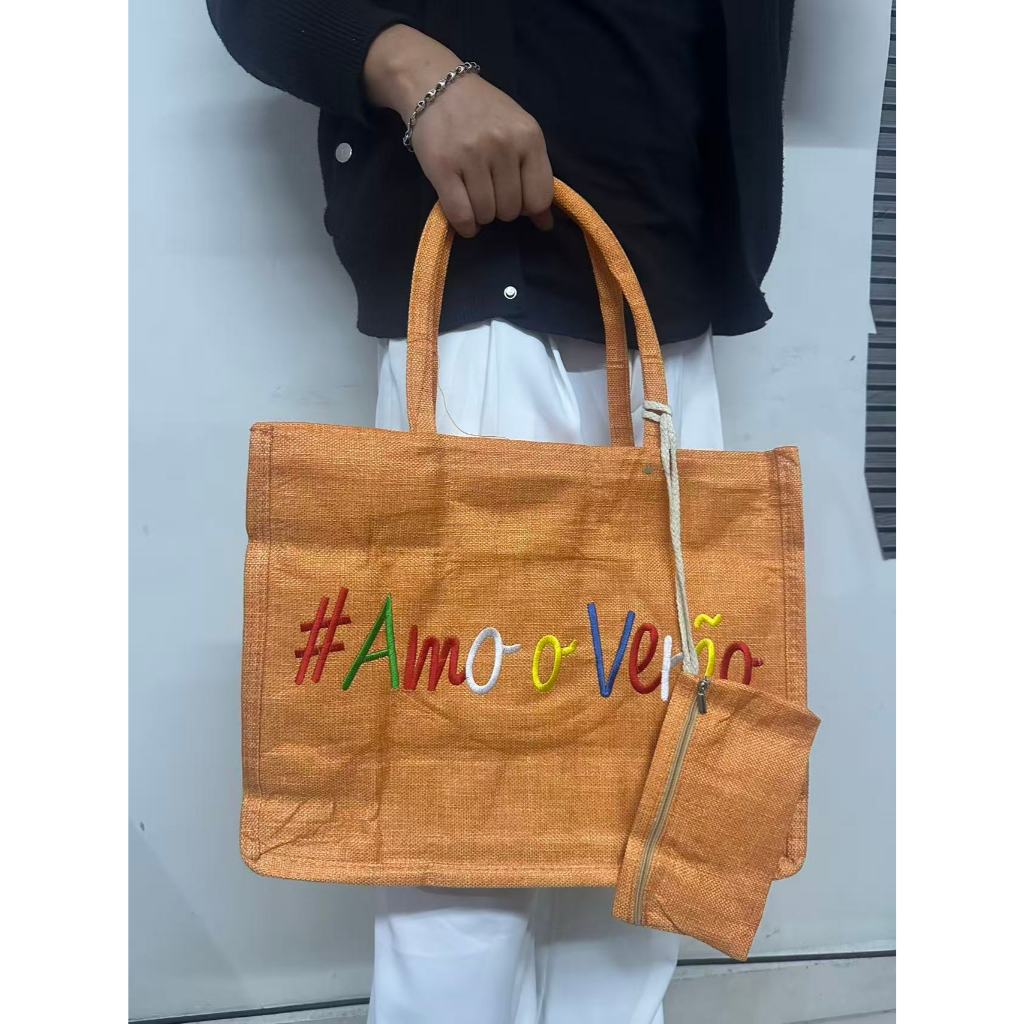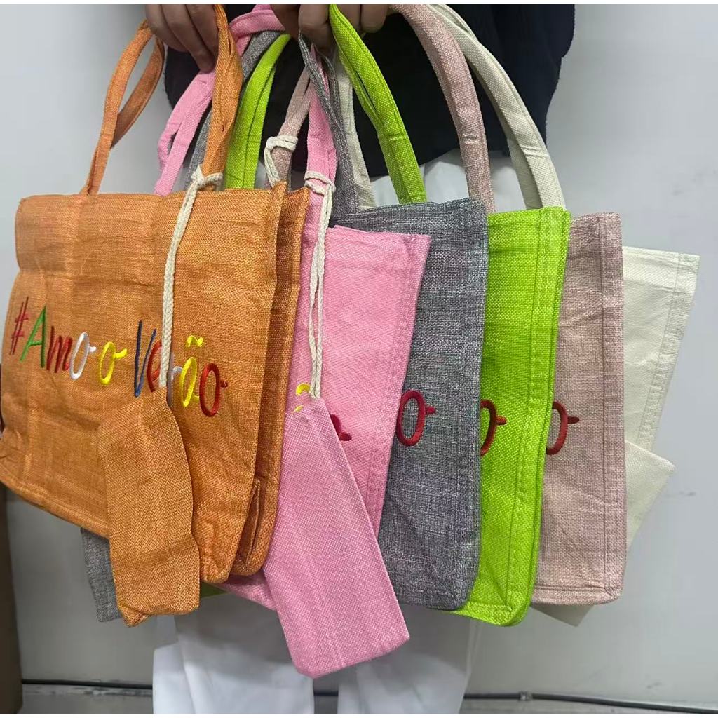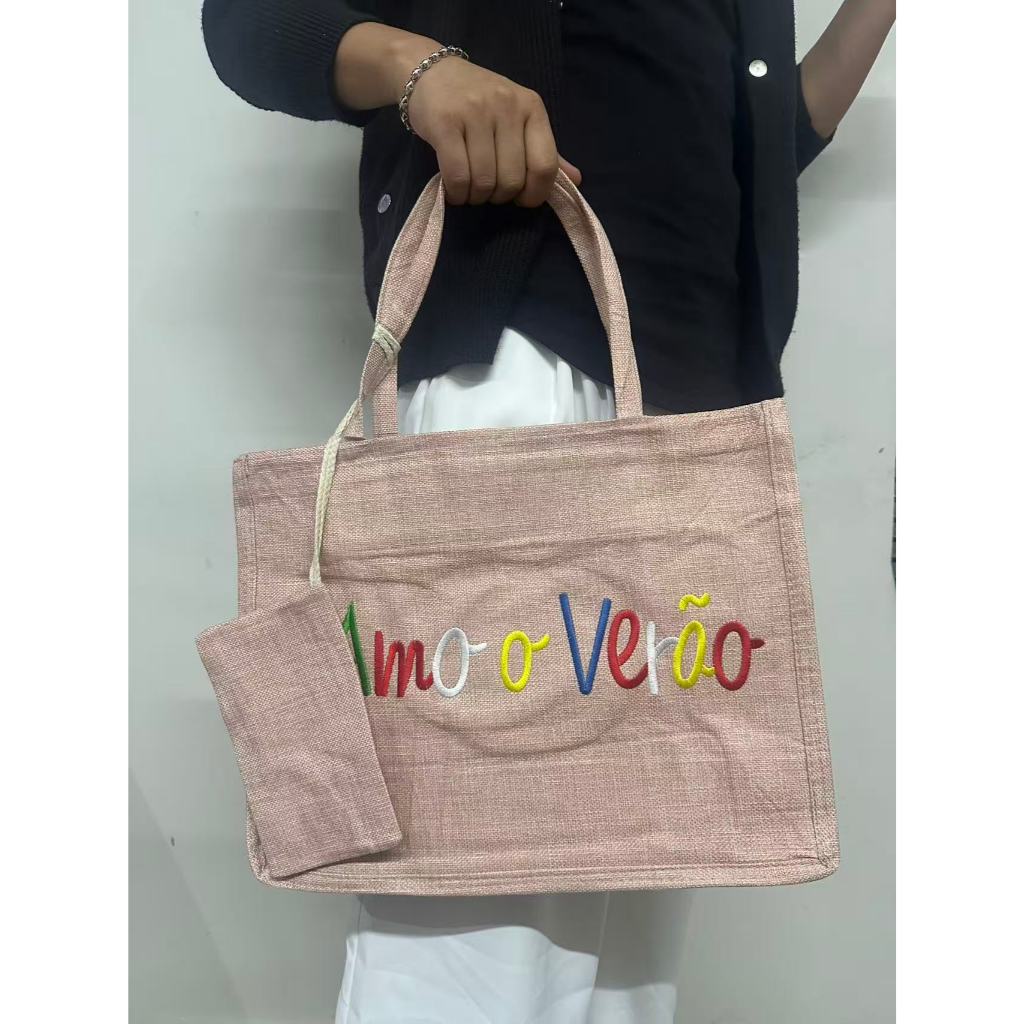 Bolsa Praia Com Zíper Grande Pallha Sintética EcoBag Juta Sacola Moda Verão Feminina Ombro