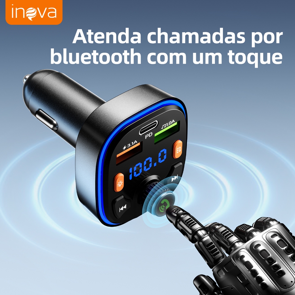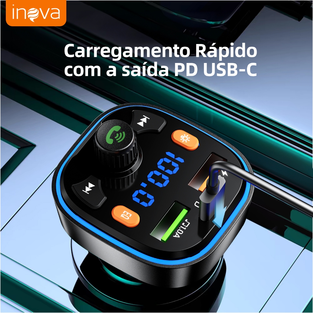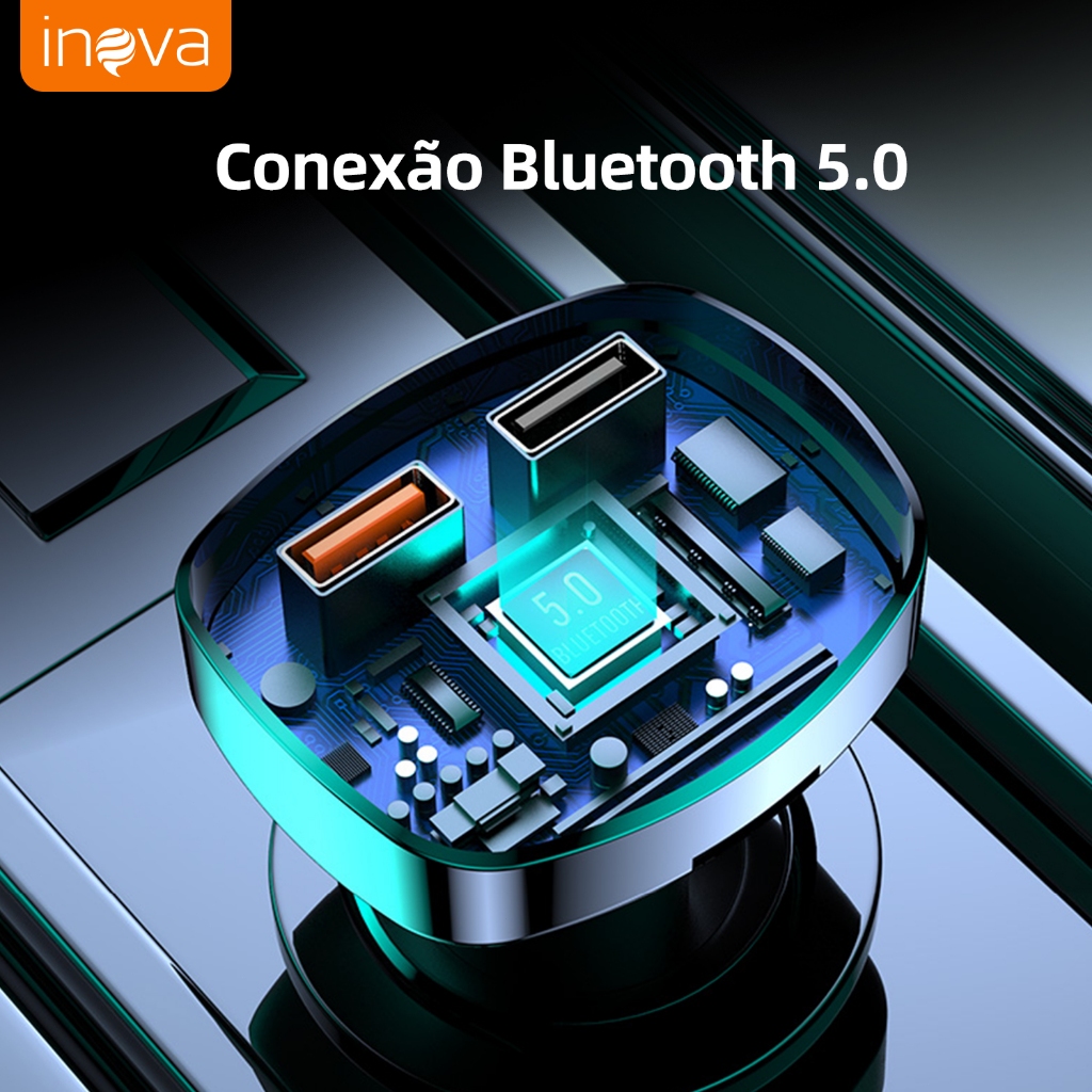INOVA Adaptador Veicular QC3.0 + Bluetooth 5.0: Transmissor FM, MP3 Player, Áudio Estéreo Modulação