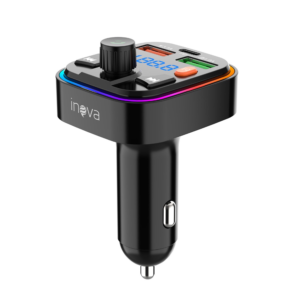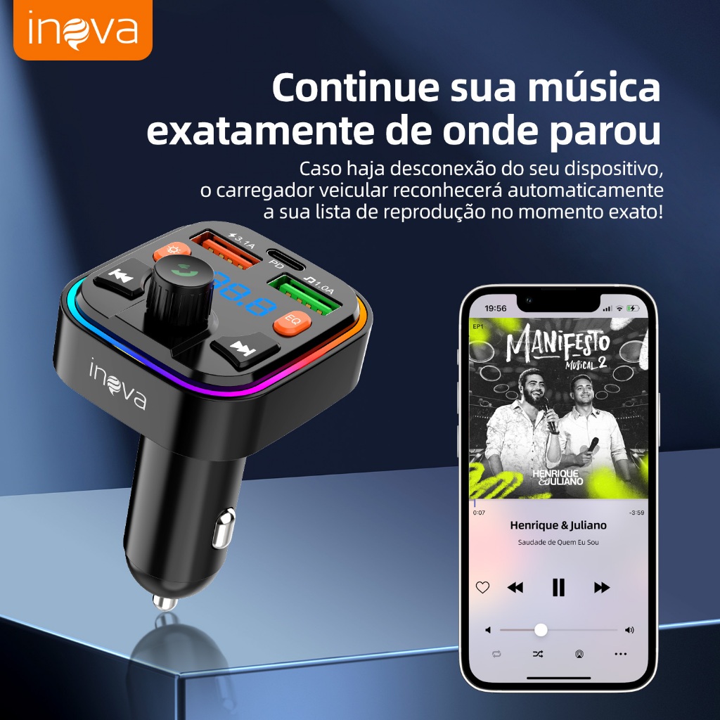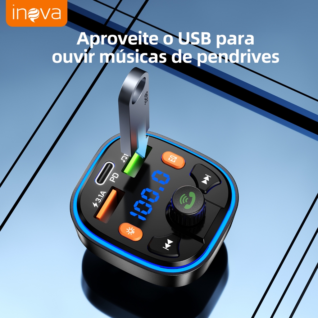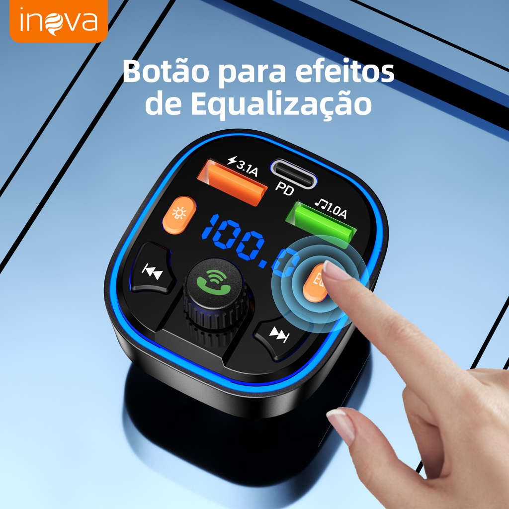 INOVA Adaptador Veicular QC3.0 + Bluetooth 5.0: Transmissor FM, MP3 Player, Áudio Estéreo Modulação