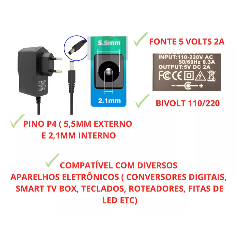 fonte de energia alimentaçao bivolt 5v 2a para tv box 2A Original Tomate