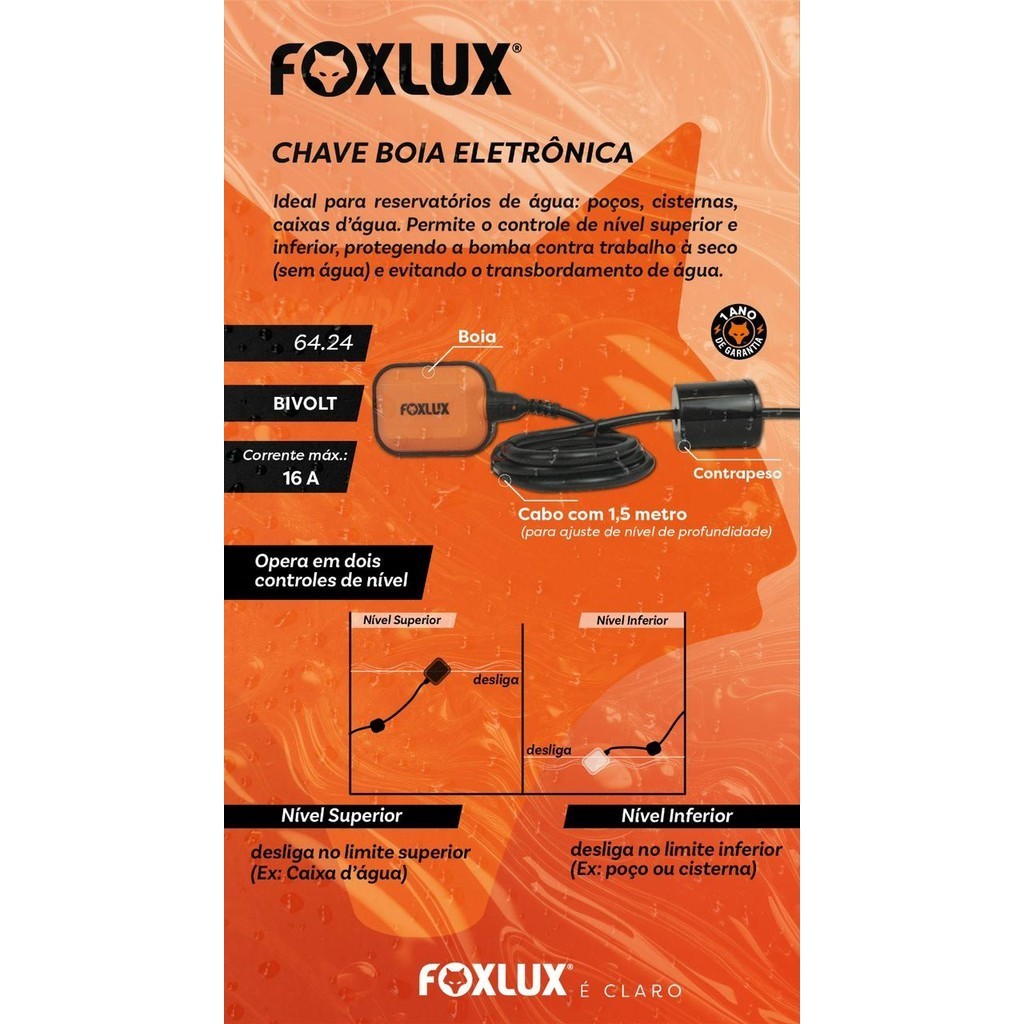Chave Boia Foxlux 16A Bivolt Automática Controle Nível Caixa Água Bomba Acionamento Automático