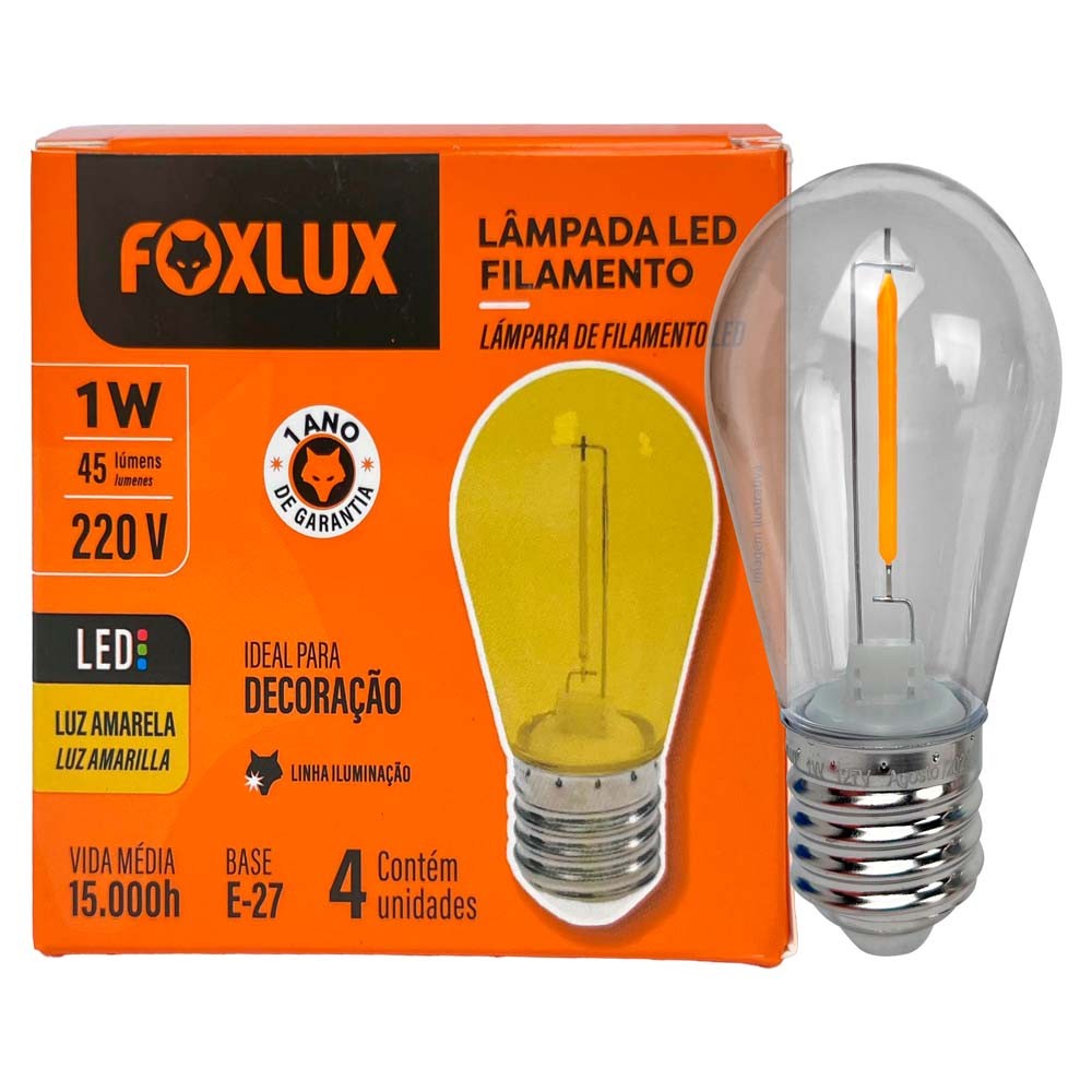 Lâmpada Led Foxlux Filamento Amarelo 1W E-27 220V 4Un | efeito decorativo, baixo consumo