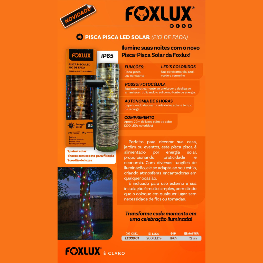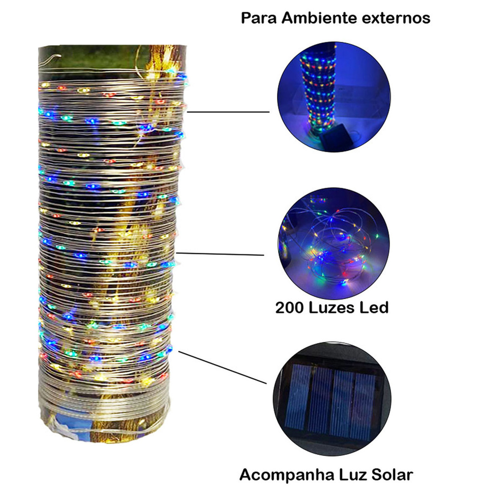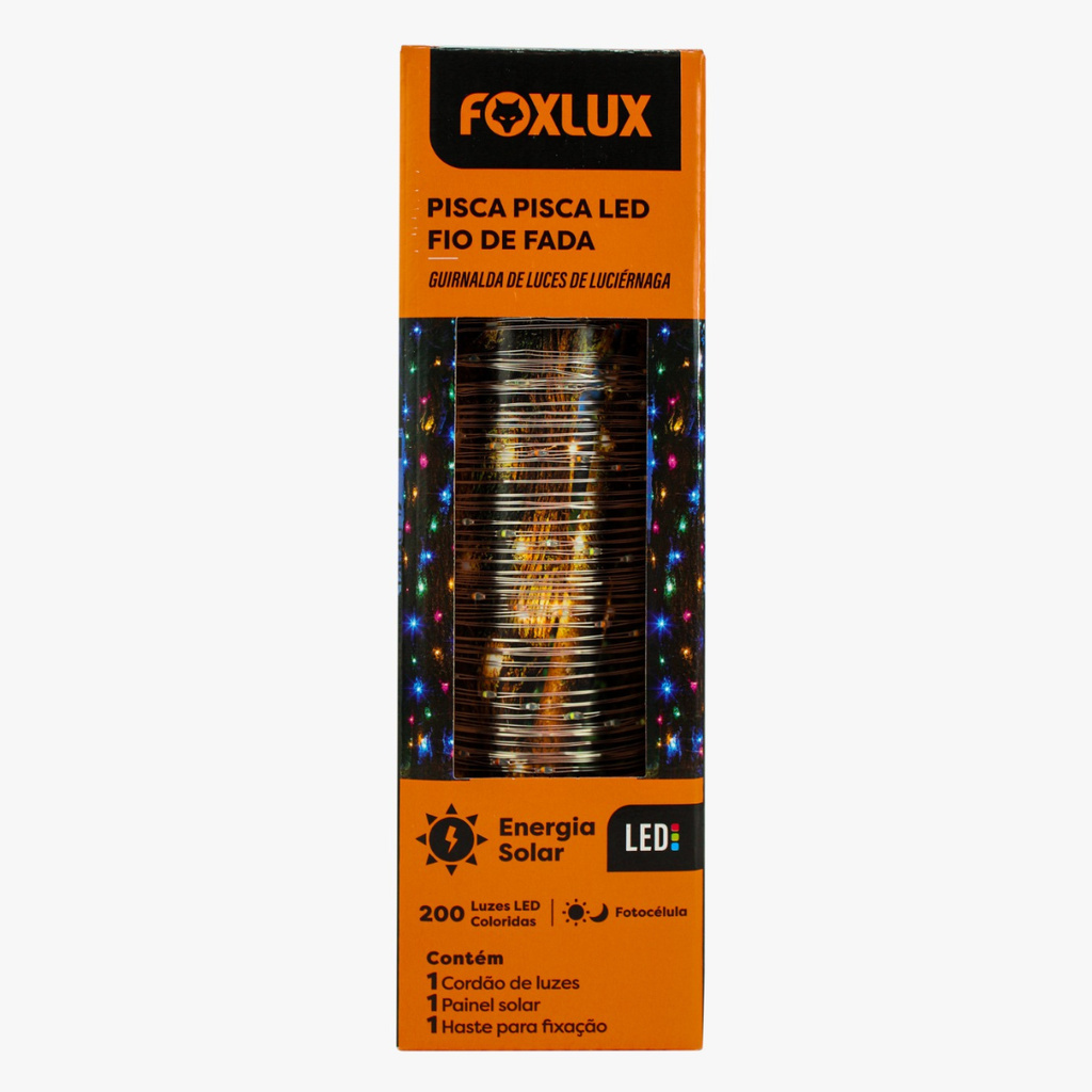 Pisca Pisca Solar Fio de Fada Foxlux 200 LEDs Coloridos 22m IP65 Externo Sensor Automático IP65